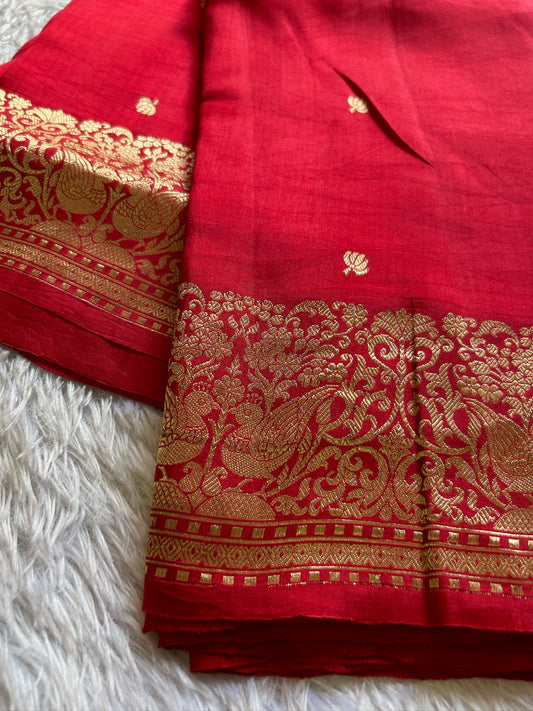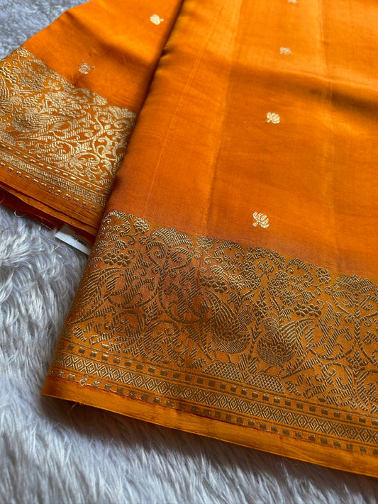 Pure Banarasi handloom Poona silk(raw mango) sarees having small zari buttas allover with beautiful zari border and pallu.