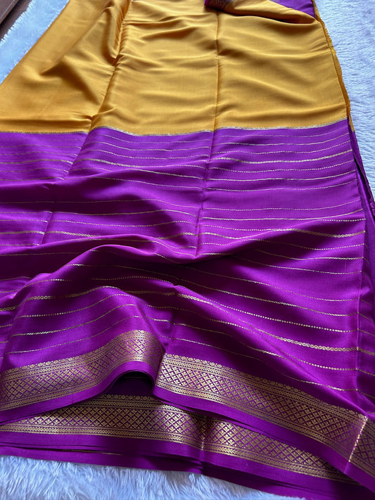Pure Mysore crepe silk in the most trending half and half pattern having lines in the second half and a solid contrast to give you a classic look.
