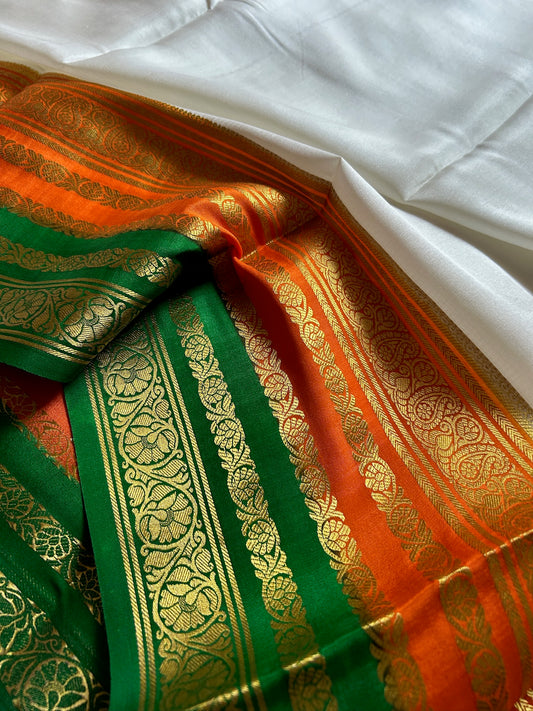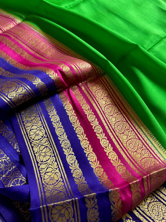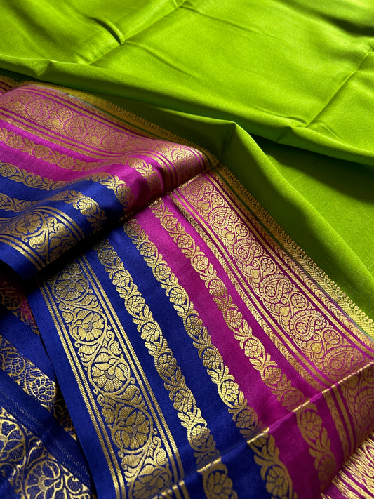 Pure Mysore crepe silk sarees with triple contrast concept.