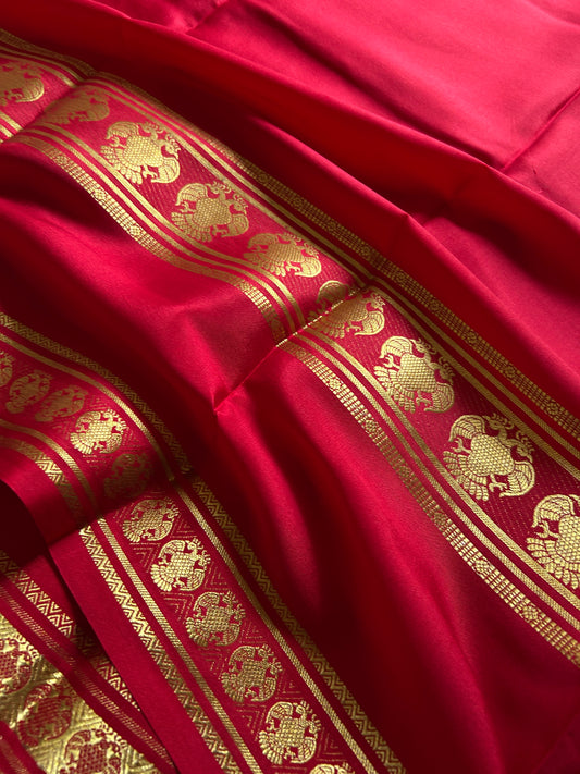 These pure Mysore crepe silk sarees come in beautiful colors with Ganda Berunda border, Ganda Berunda is a powerful two-headed bird deeply rooted in Indian history, especially as the royal emblem of Mysore.