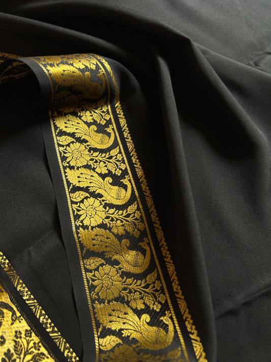 Pure Mysore crepe silk sarees of 110 GSM and beautiful zari border with peacock and floral motifs.