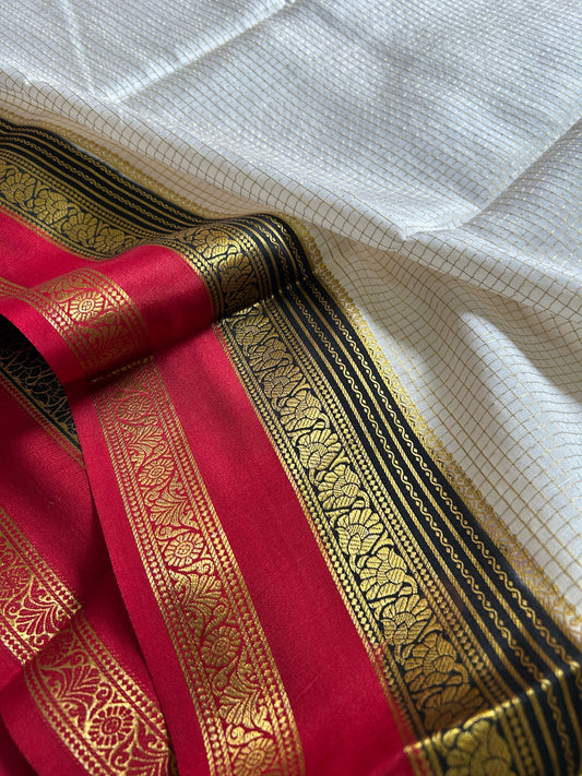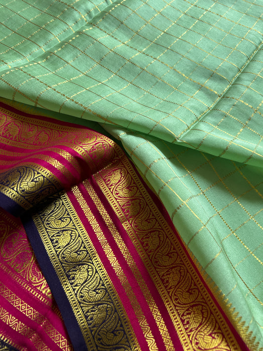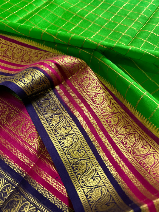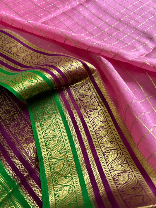 Pure Mysore crepe silk sarees with stunning triple contrast border.