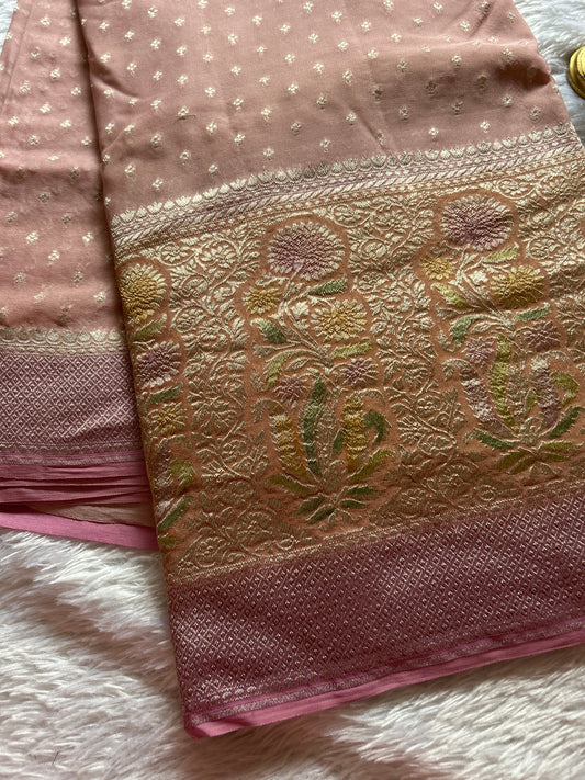 Pure chiffon kaddi georgette sarees with small buttas allover, border and pallu with intricate meenakari work.