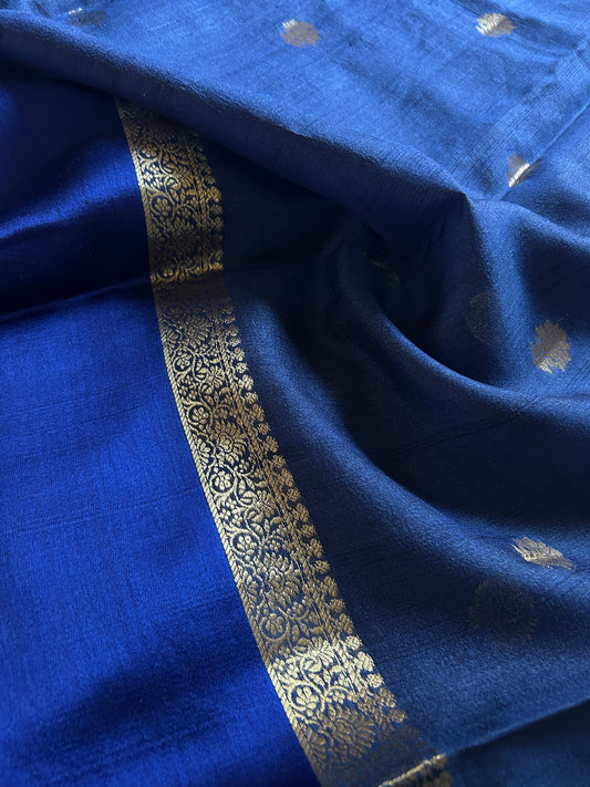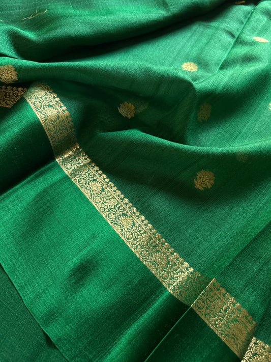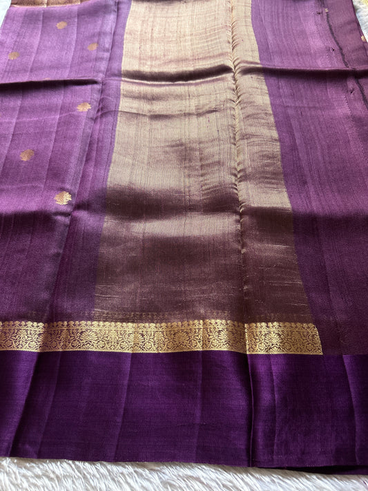 Pure raw tussar georgette sarees with small zari buttas allover and satin border with zari work on the inner side.
