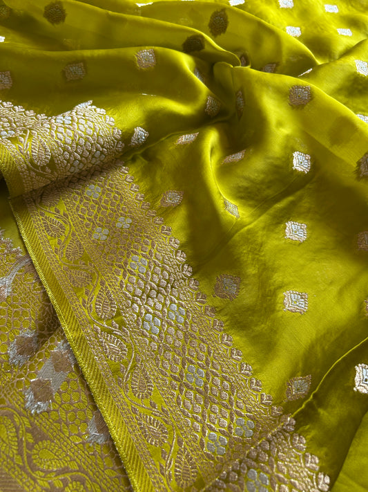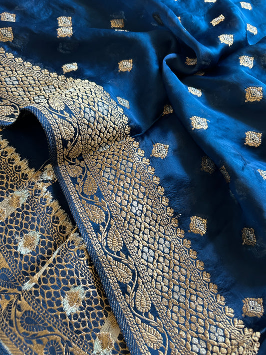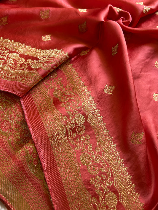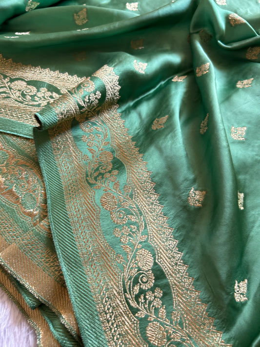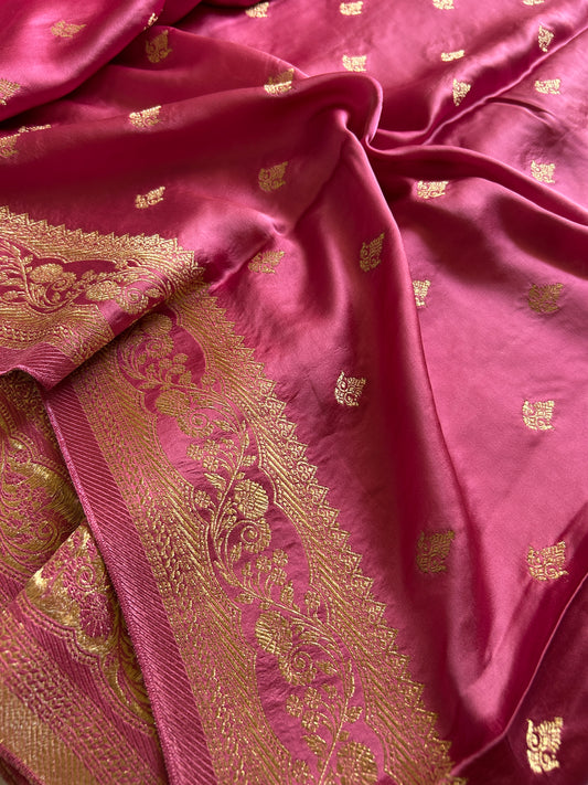 Soft satin mashru silk sarees with beautiful buttas allover, rich intricate Banarasi zari work on border and pallu.