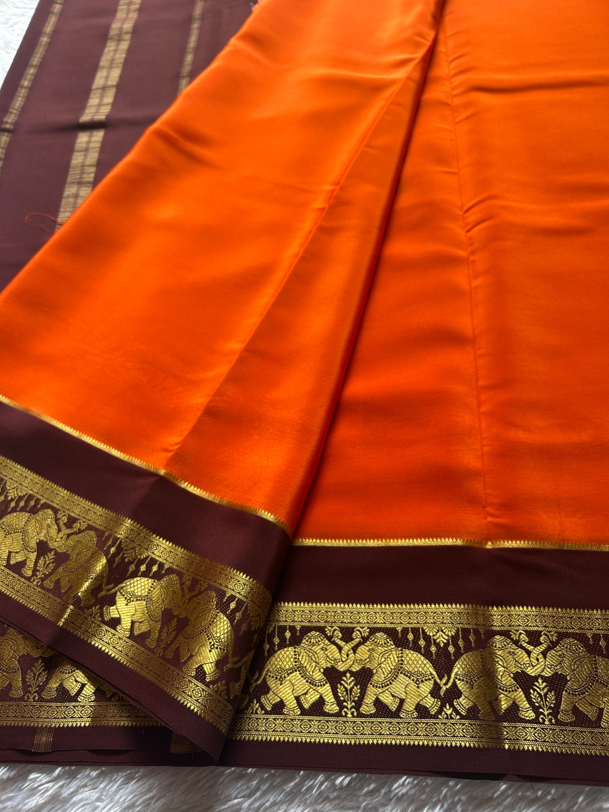 Airavati (2D) showcases the timeless elegance of pure Mysore crepe silk in a vibrant dark orange hue. This 110 GSM saree features a sophisticated chocolate brown border and pallu, meticulously embellished with copper silver silk (CSS) zari work. The border is adorned with an intricate zari elephant motif, a classical design element that adds regal charm. The lightweight crepe construction ensures graceful draping while maintaining the fabric's natural sheen, making this piece ideal for both festive occasions and refined everyday wear. A masterpiece that balances traditional craftsmanship with contemporary aesthetics.
