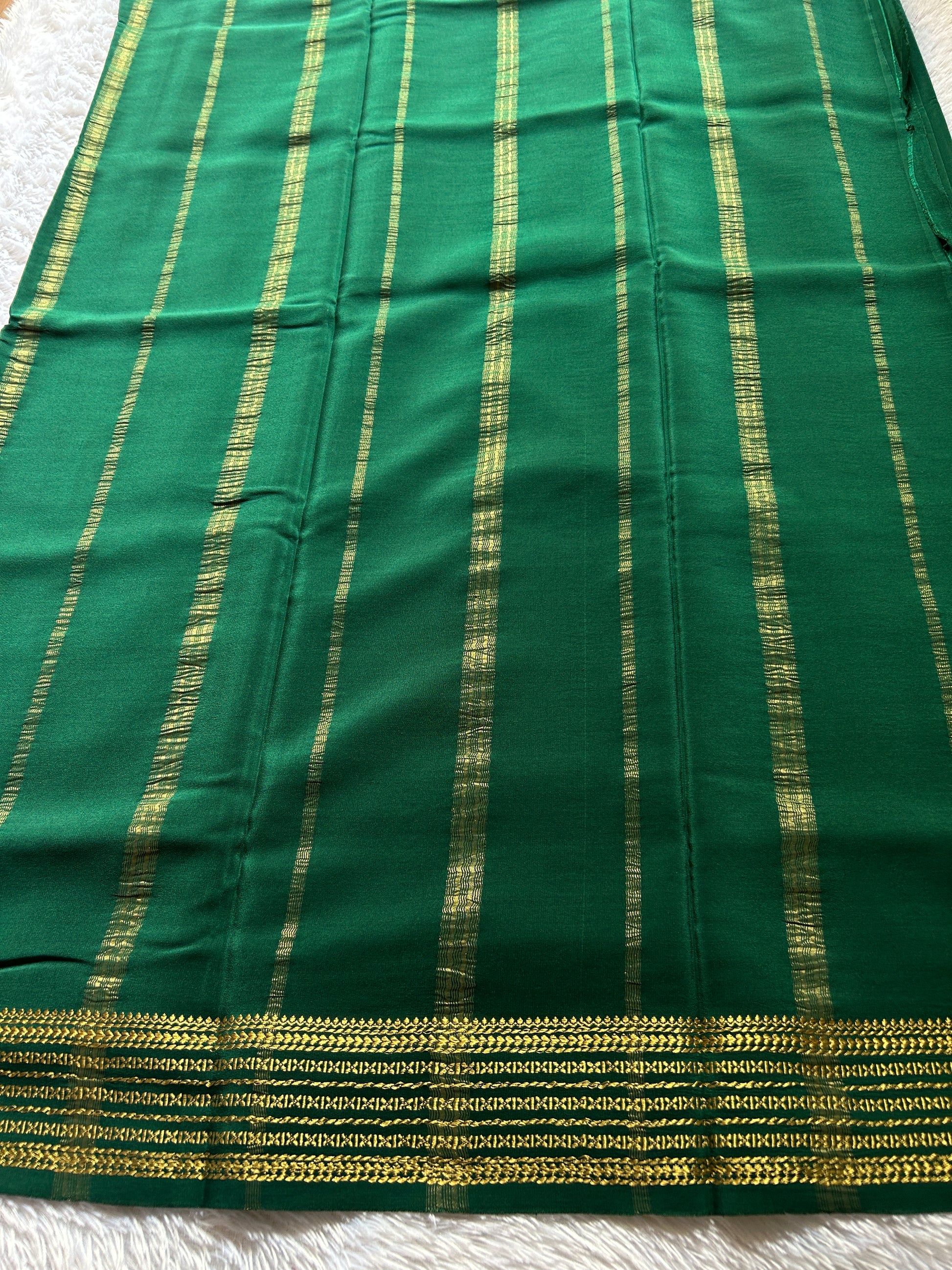 Akshaya presents a sophisticated bottle green Mysore crepe silk saree, crafted with pure CSG (Copper Silver Gold) zari throughout. This timeless piece features an intricate classic CSG zari lines border that adds refined elegance to the drape. The luxurious crepe silk fabric offers a graceful flow and subtle texture, while the precious metal zari work ensures lasting brilliance. Perfect for festive occasions and celebrations, this saree combines traditional craftsmanship with enduring style. The rich bottle green hue complements all skin tones, making it a versatile addition to your ethnic wardrobe.