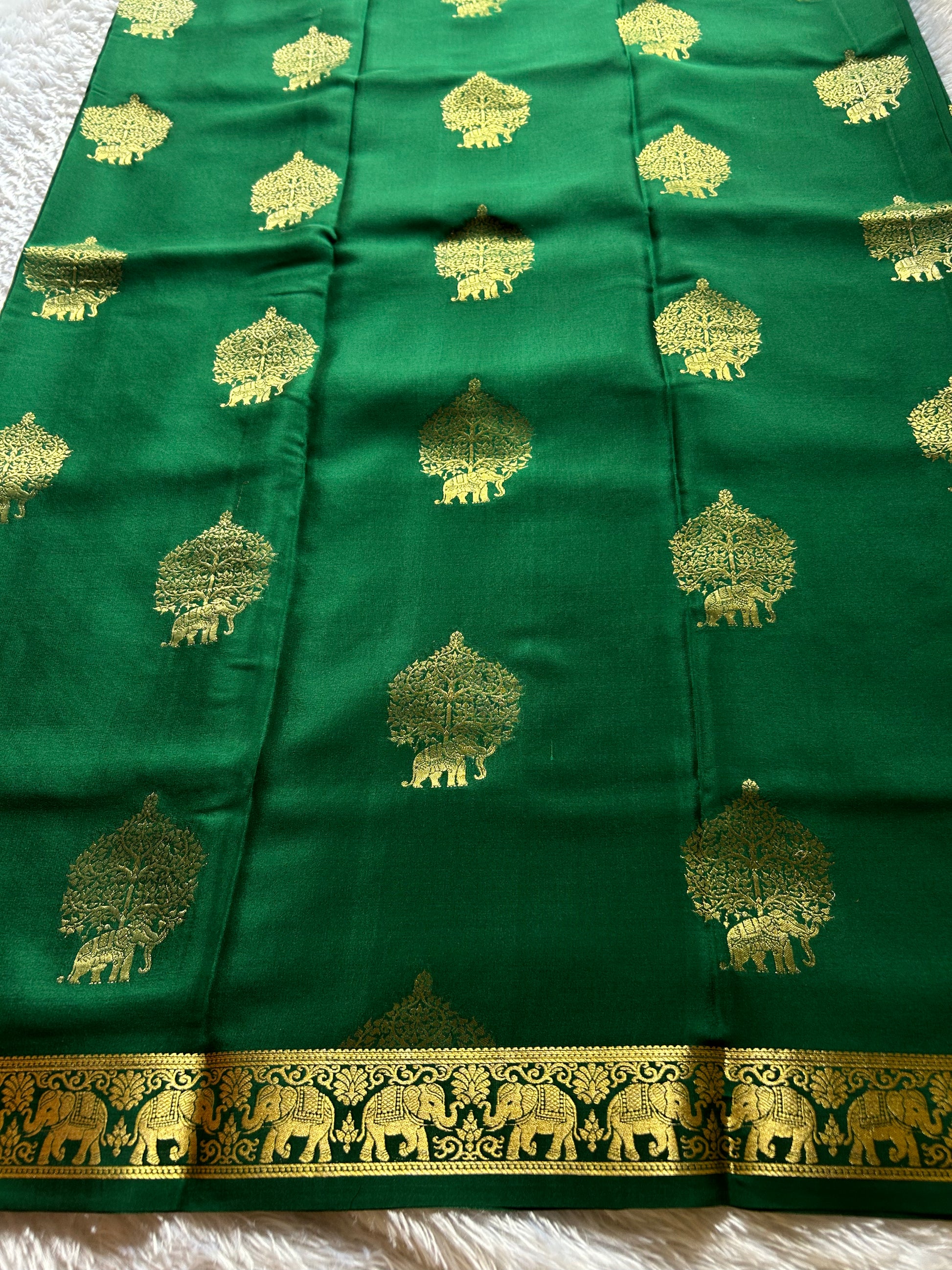 Elevate your collection with this exquisite dark green Mysore crepe silk saree, a masterpiece of traditional craftsmanship. The fabric showcases delicate zari elephant ambari buttas scattered throughout, creating an understated elegance. The border features an intricate zari elephant motif that commands attention, while the pallu displays the same sophisticated detailing for a cohesive design. The pure Mysore crepe silk drapes beautifully, offering both comfort and luxury. Perfect for festive occasions and celebrations, this saree seamlessly blends timeless artistry with refined aesthetics.