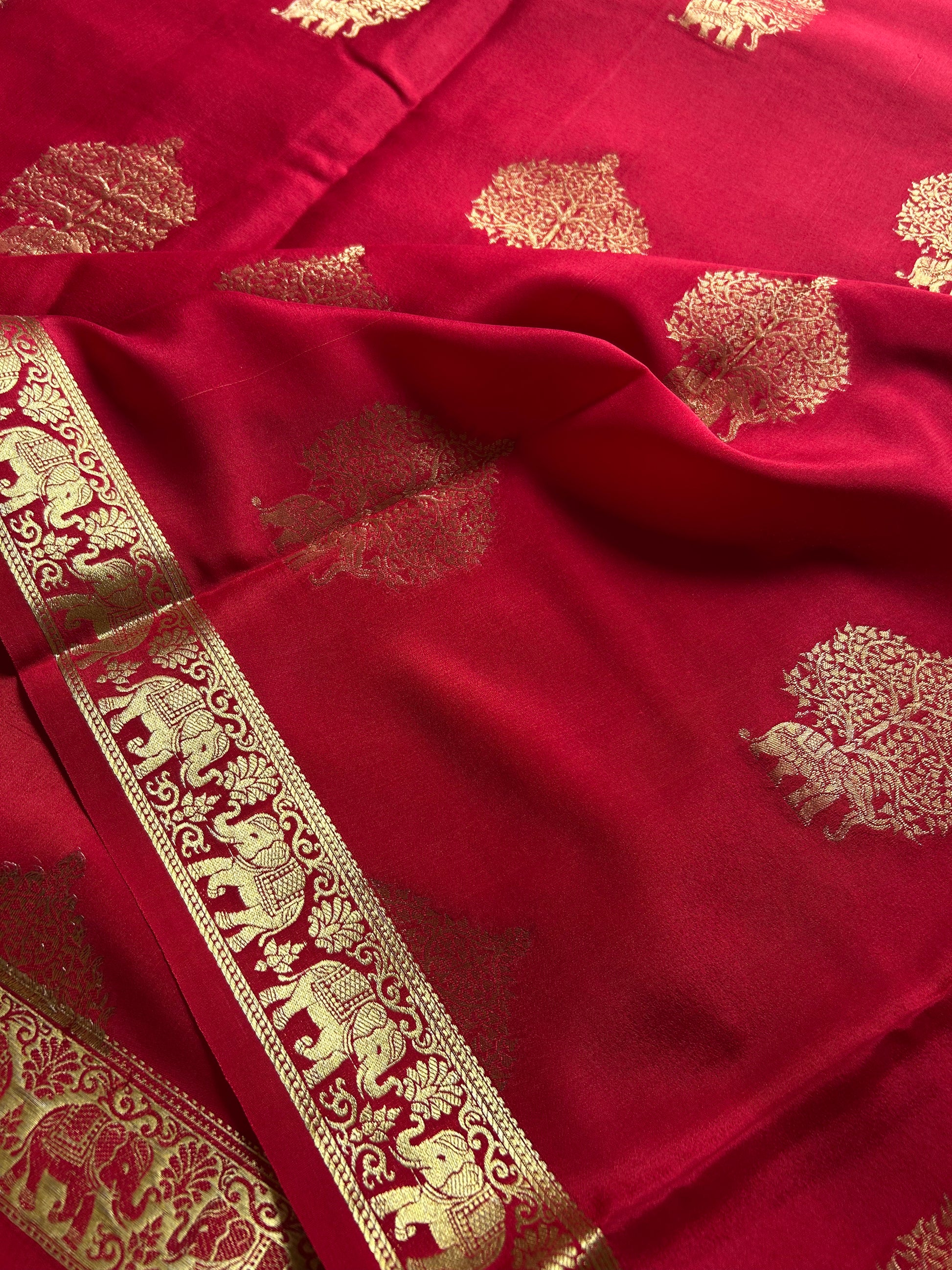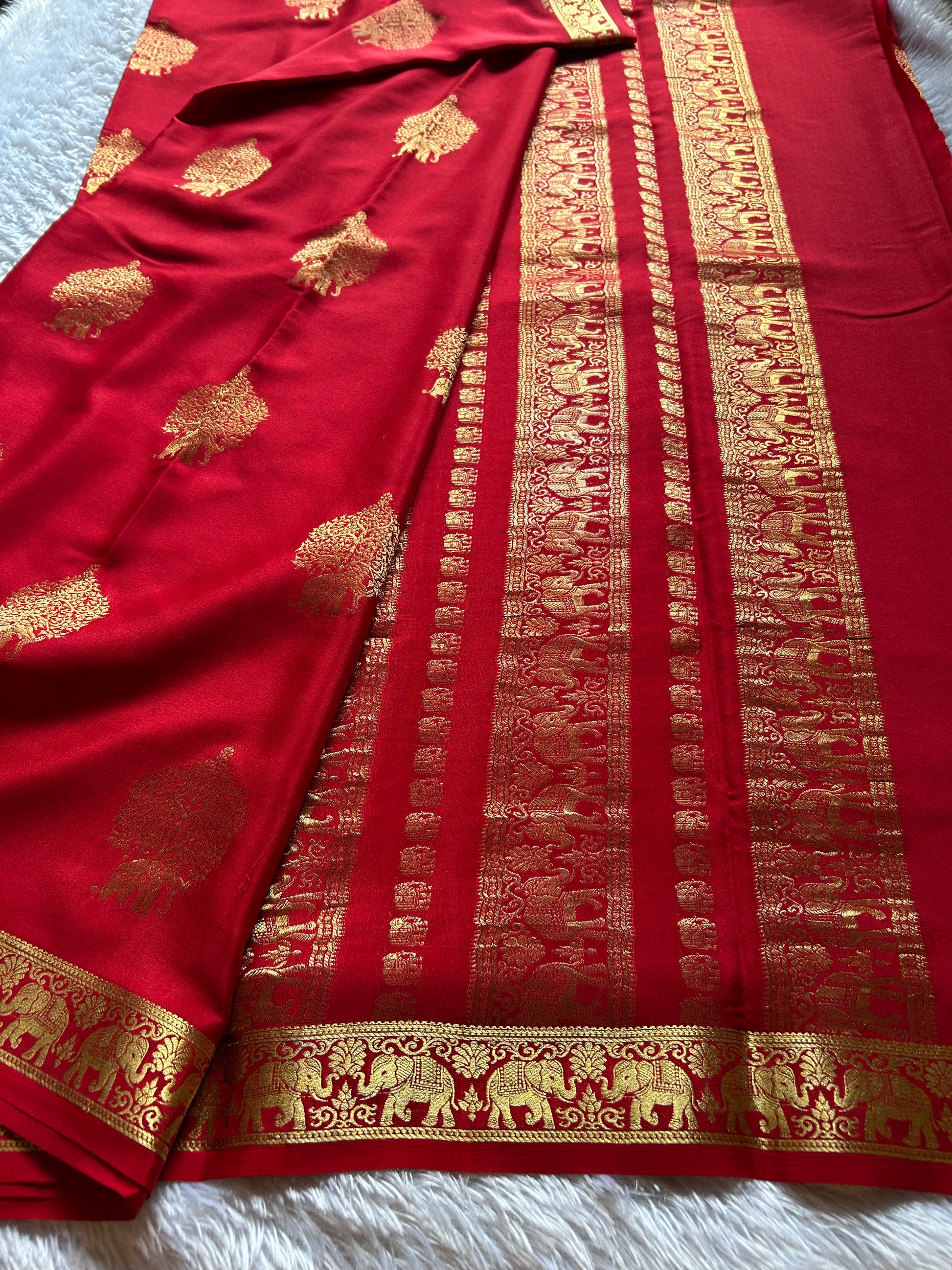 Elevate your collection with this striking red Mysore crepe silk saree, a masterpiece of traditional craftsmanship. The fabric drapes with refined elegance, showcasing delicate zari elephant ambari buttas scattered across the entire weave. The border features an intricate zari elephant motif that commands attention, while the pallu displays the same sophisticated detailing for a cohesive, luxurious aesthetic. Perfect for weddings, celebrations, and formal occasions, this saree combines timeless design with superior silk quality. The interplay of pure silk and lustrous zari work creates a piece that exudes understated grandeur and cultural richness.