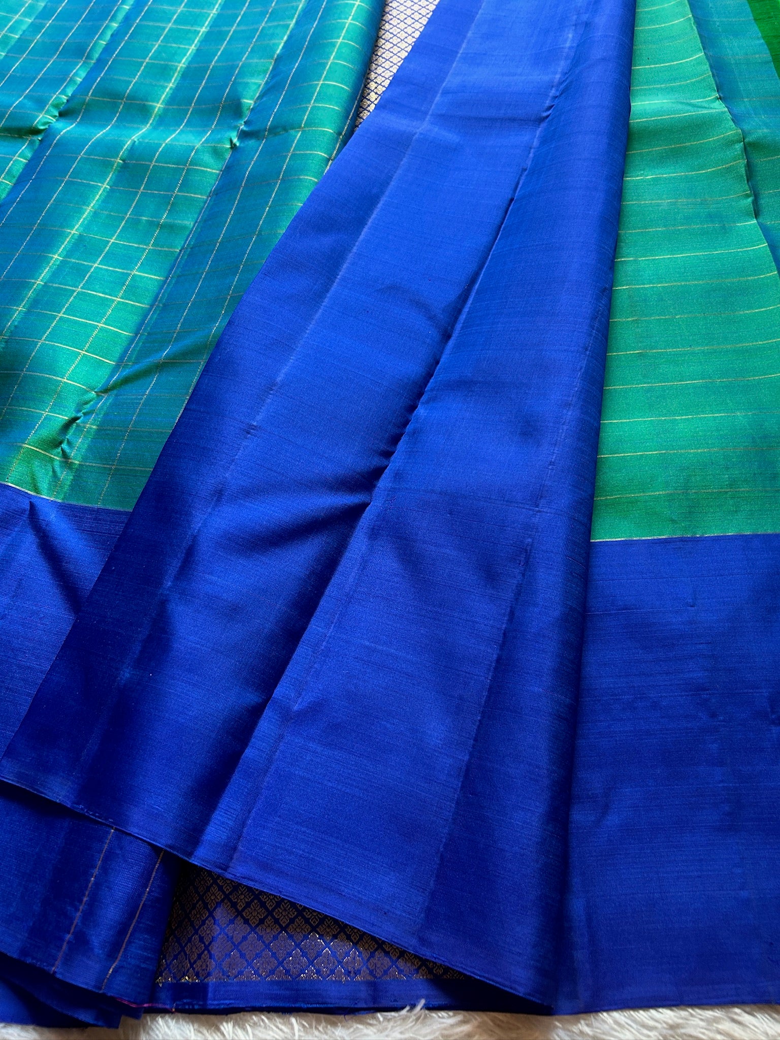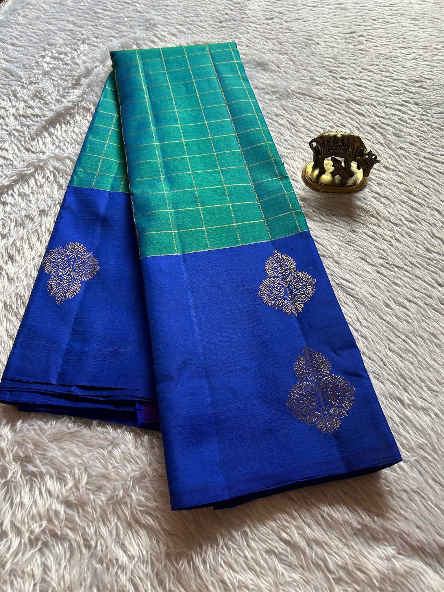 This turquoise pure Kancheepuram silk saree showcases exquisite craftsmanship with delicate zari checks woven throughout. The rich zari work on the pallu enhances its traditional appeal, while the elegant royal blue border features finely detailed zari flower motifs, adding a regal touch. Perfect for formal occasions, this saree combines vibrant hues and intricate artistry to create a timeless piece reflecting expert heritage weaving.
