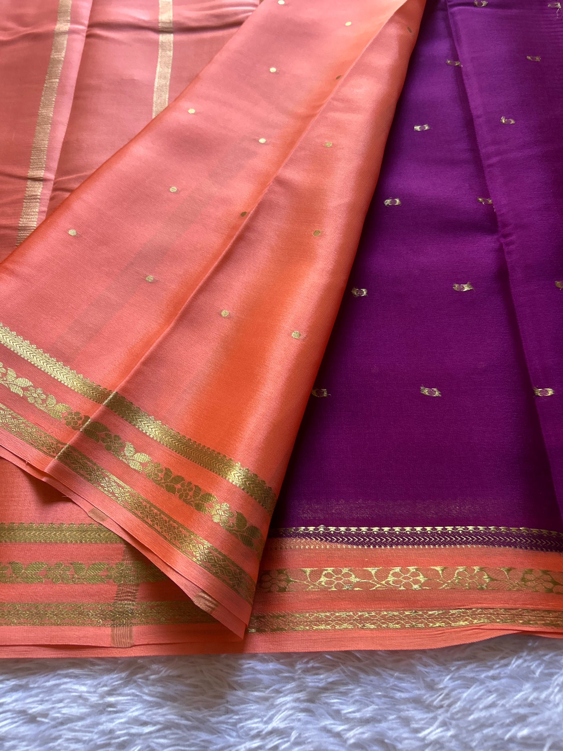 Drape yourself in timeless elegance with this wine Mysore crepe silk saree, a masterpiece of refined craftsmanship. The lightweight pure silk fabric flows effortlessly, adorned with delicate scattered buttas throughout. The peach border and pallu showcase intricate zari work, creating a striking contrast that elevates any occasion. Perfect for celebrations, this saree combines traditional artistry with contemporary sophistication, offering both comfort and luxury in every wear.