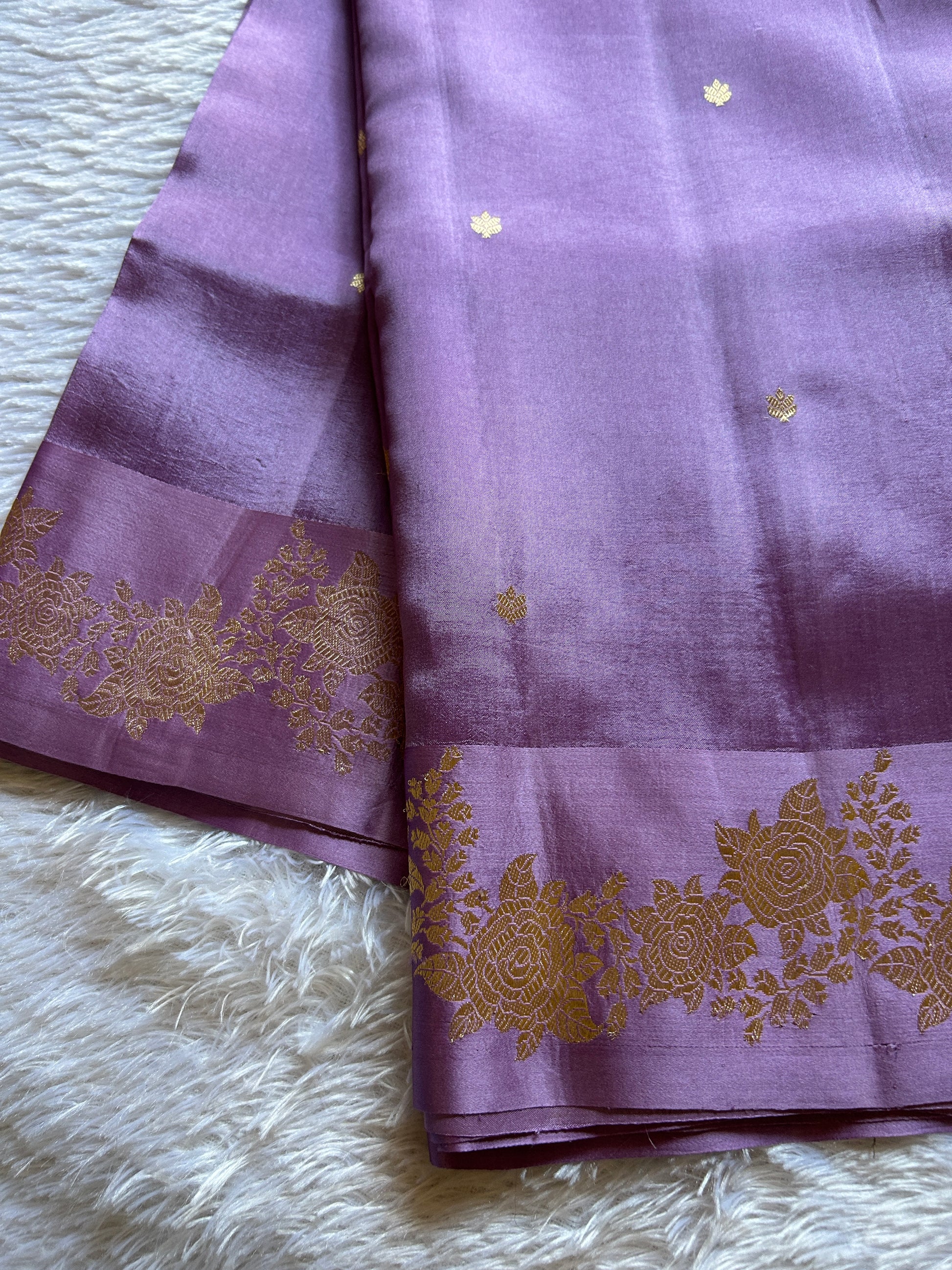 Discover timeless elegance with this solid lavender Banarasi handloom saree, meticulously crafted from premium Poona silk. Delicate zari buttas are artfully scattered across the fabric, creating subtle dimension and depth. The saree showcases a magnificent Banarasi zari border and an intricately woven pallu that exemplifies traditional craftsmanship. Each piece reflects the heritage of authentic handloom weaving, offering a sophisticated choice for special occasions. Complemented by a contrasting purple blouse material, this saree seamlessly blends classic beauty with refined luxury.