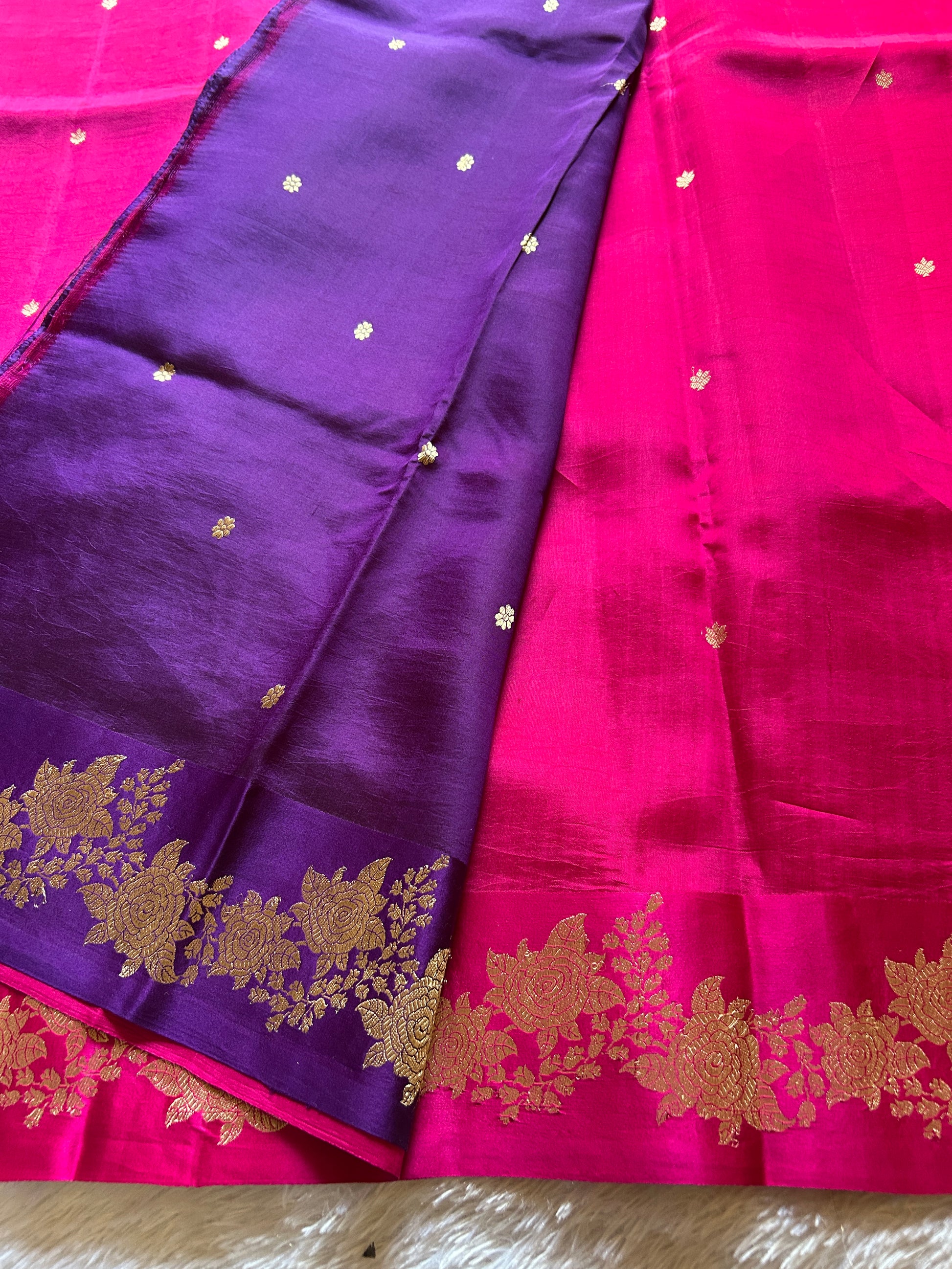 Elevate your ethnic wardrobe with this stunning solid pink Banarasi saree, meticulously handwoven from premium Poona silk. Delicate zari buttas are artfully scattered across the fabric, creating an understated yet sophisticated allure. The saree showcases a magnificent Banarasi zari border and an intricately patterned pallu that exemplifies traditional weaving craftsmanship. The rich pink hue is beautifully complemented by a contrasting purple blouse piece, offering versatility for styling. Perfect for weddings, festivals, and special occasions, this timeless piece combines heritage artistry with contemporary elegance.