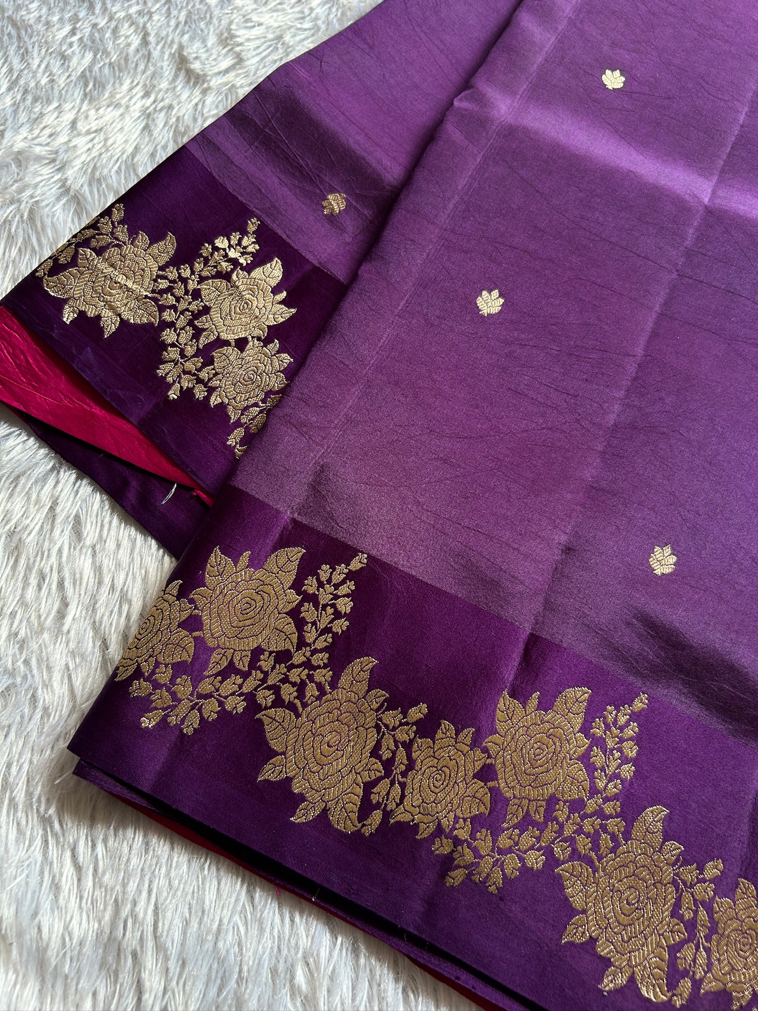 Elevate your wardrobe with the Anupama Solid Purple Banarasi handloom saree crafted from rich Poona silk. This exquisite saree features delicate small zari buttas scattered throughout, accentuating the luxurious texture. Highlighted by a stunning Banarasi zari border and intricately woven pallu, it exemplifies traditional craftsmanship. Paired with a contrasting pink blouse material, this ensemble offers a refined balance of elegance and vibrancy, perfect for special occasions and festive celebrations.