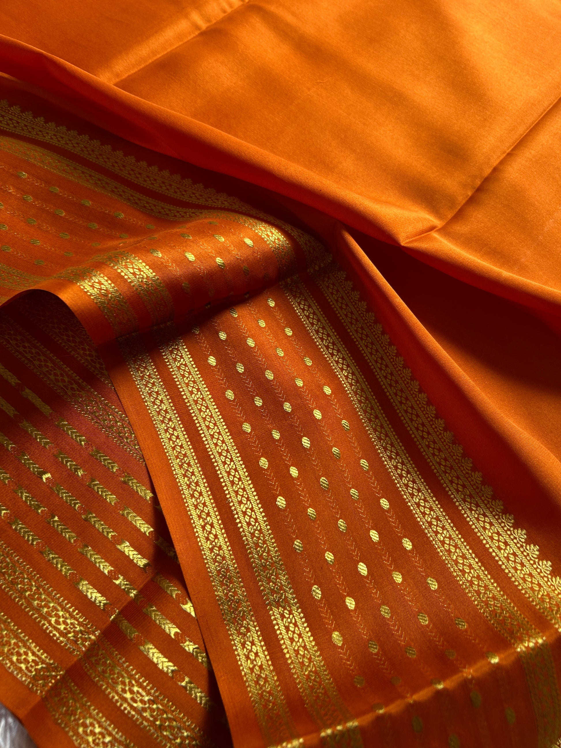 Experience elegance with the Aradhya orange saree crafted from pure Mysore crepe silk. Its subtle gap border is enhanced by intricate zari work and delicate zari buttas, adding a refined shimmer that complements its rich texture. This saree blends traditional craftsmanship with a modern color palette, ideal for sophisticated occasions where understated luxury is desired.