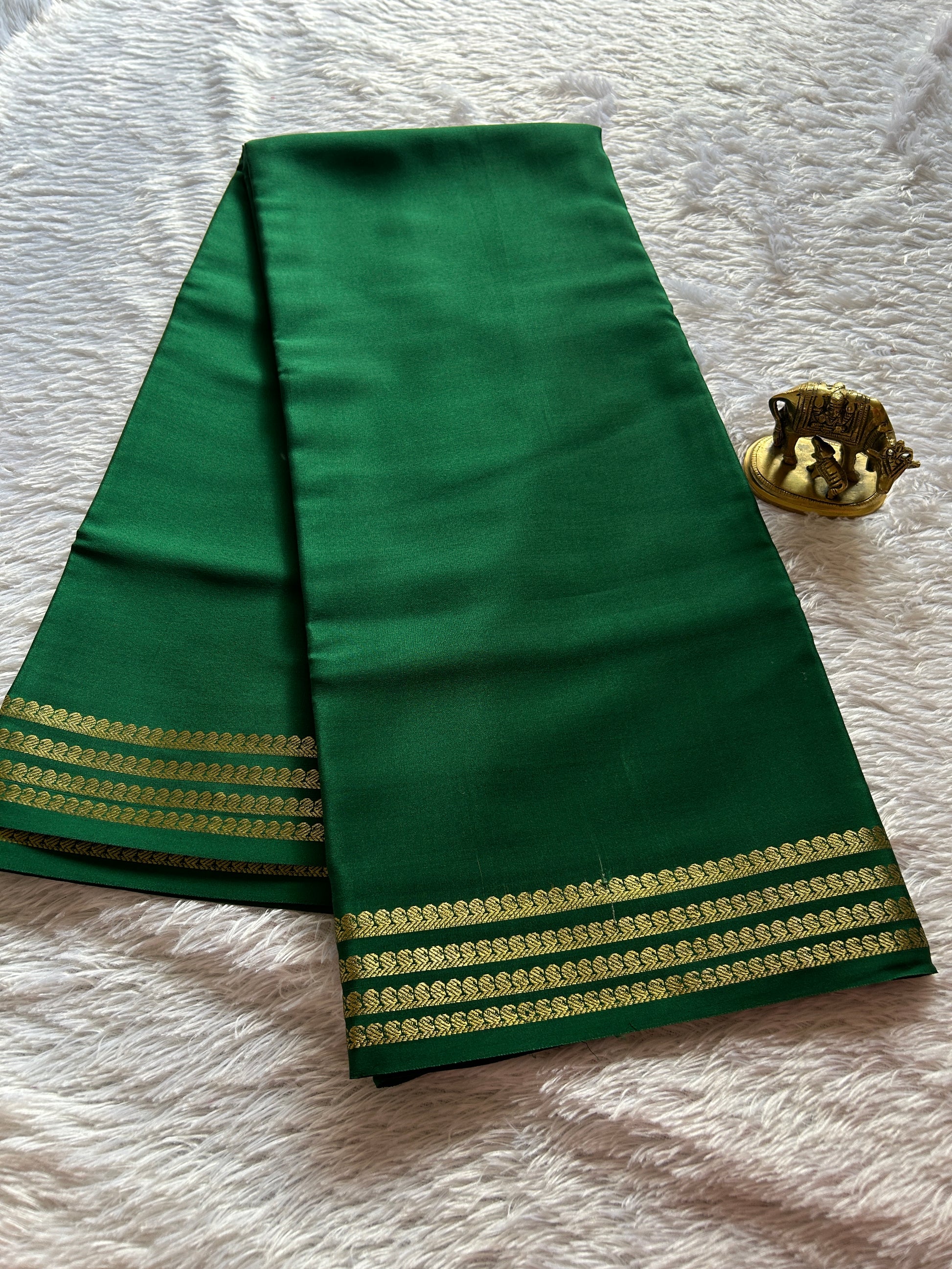 This bottle green Mysore crepe silk saree features a beautiful zari mango pattern border, adding a touch of elegance to its rich, solid color. Crafted from pure silk, it offers a smooth texture and graceful drape, perfect for traditional occasions or festive wear.