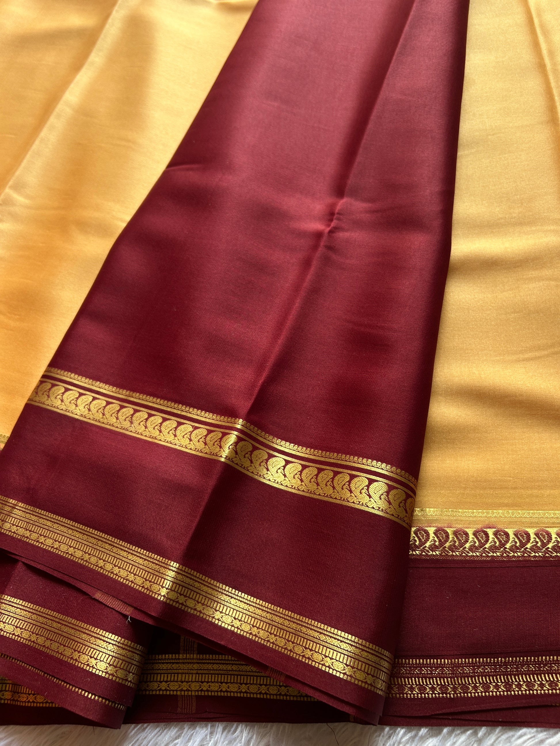 Elevate your ethnic wardrobe with this exquisite Mysore crepe silk saree, a masterpiece of refined craftsmanship. The soft beige base offers timeless elegance, while the chocolate brown gap border commands attention with intricate zari embroidery that catches light beautifully. Crafted from pure Mysore silk, this lightweight saree drapes effortlessly, making it ideal for both festive occasions and refined everyday wear. The sophisticated color palette and detailed border work showcase traditional artistry, ensuring you stand out with understated luxury. Perfect for those who appreciate quality fabrics and meticulous design.