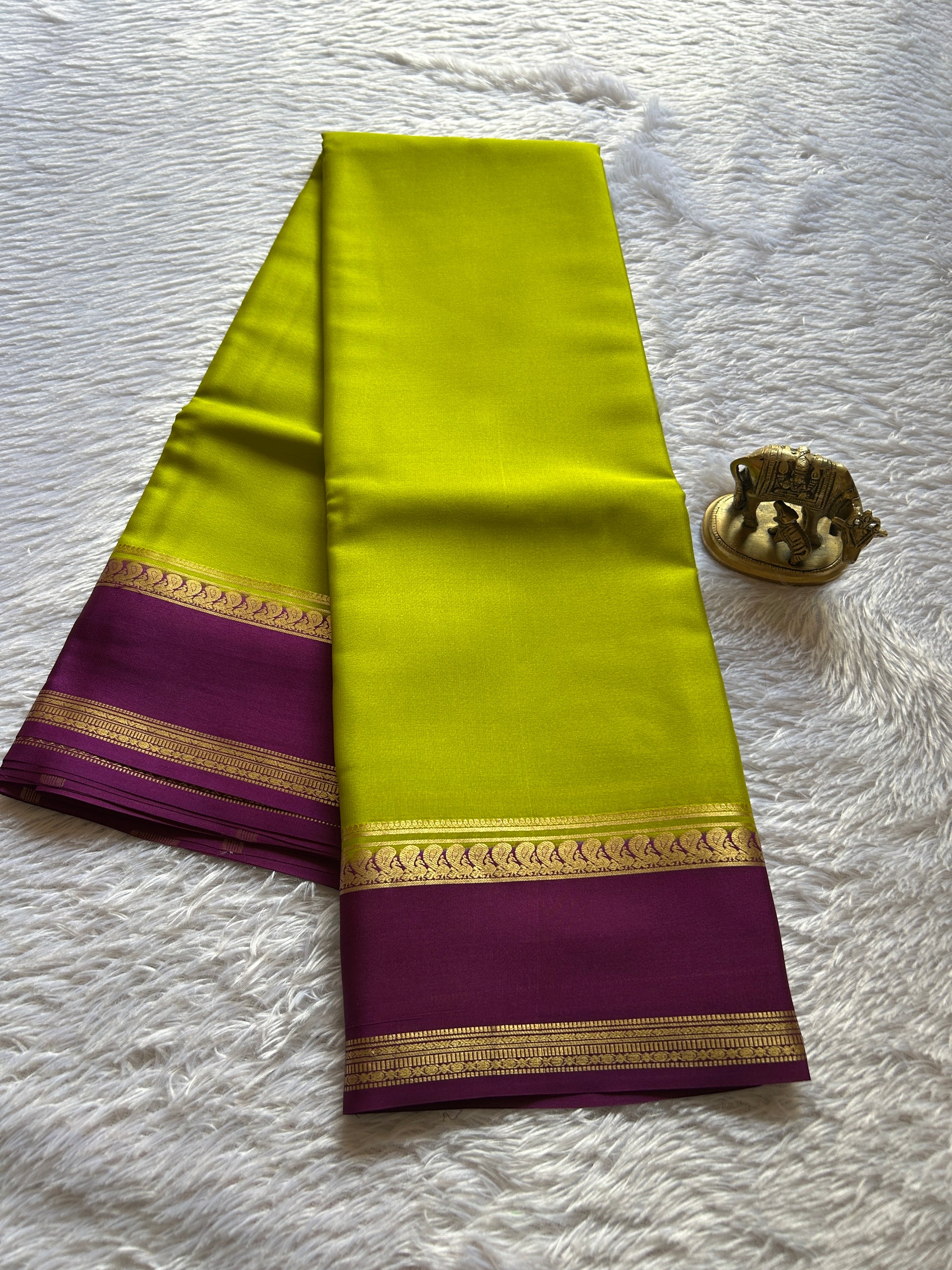 Arathi presents an exquisite fusion of understated elegance and vibrant contrast. Crafted from pure Mysore crepe silk, this saree drapes with a fluid, refined grace that defines contemporary saree aesthetics. The sophisticated olive green base provides a versatile canvas, while the striking magenta gap border commands attention with its bold presence. Intricate zari work adorns the border, showcasing traditional craftsmanship with meticulous detail. The lightweight construction ensures comfortable wear throughout the day, making this piece equally suited for formal occasions and refined gatherings. A masterclass in color coordination and textile quality.