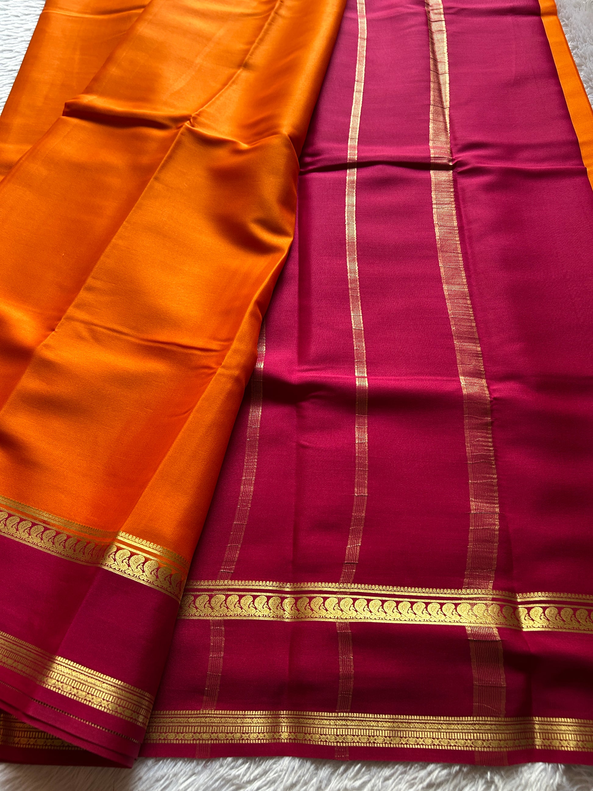 Elevate your ethnic wardrobe with this exquisite Mysore crepe silk saree in vibrant orange. Crafted from pure silk, the fabric offers a lightweight drape that moves gracefully with every step, making it ideal for both festive occasions and everyday elegance. The striking pink gap border features intricate zari work that adds a layer of sophistication and traditional craftsmanship. This timeless piece seamlessly blends comfort with refined aesthetics, perfect for those who appreciate quality textiles and authentic design.