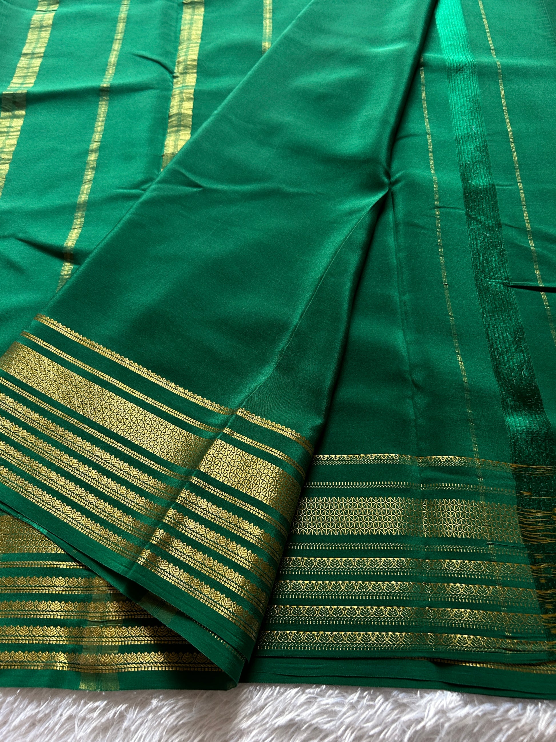 This bottle green Mysore crepe silk saree, weighing 110 GSM, showcases the rich heritage of classic craftsmanship. Its pure silk fabric offers a smooth, elegant drape while the intricate zari border adds a timeless touch of sophistication. Perfect for formal occasions, this saree blends traditional artistry with understated luxury, ensuring both comfort and style throughout the day.