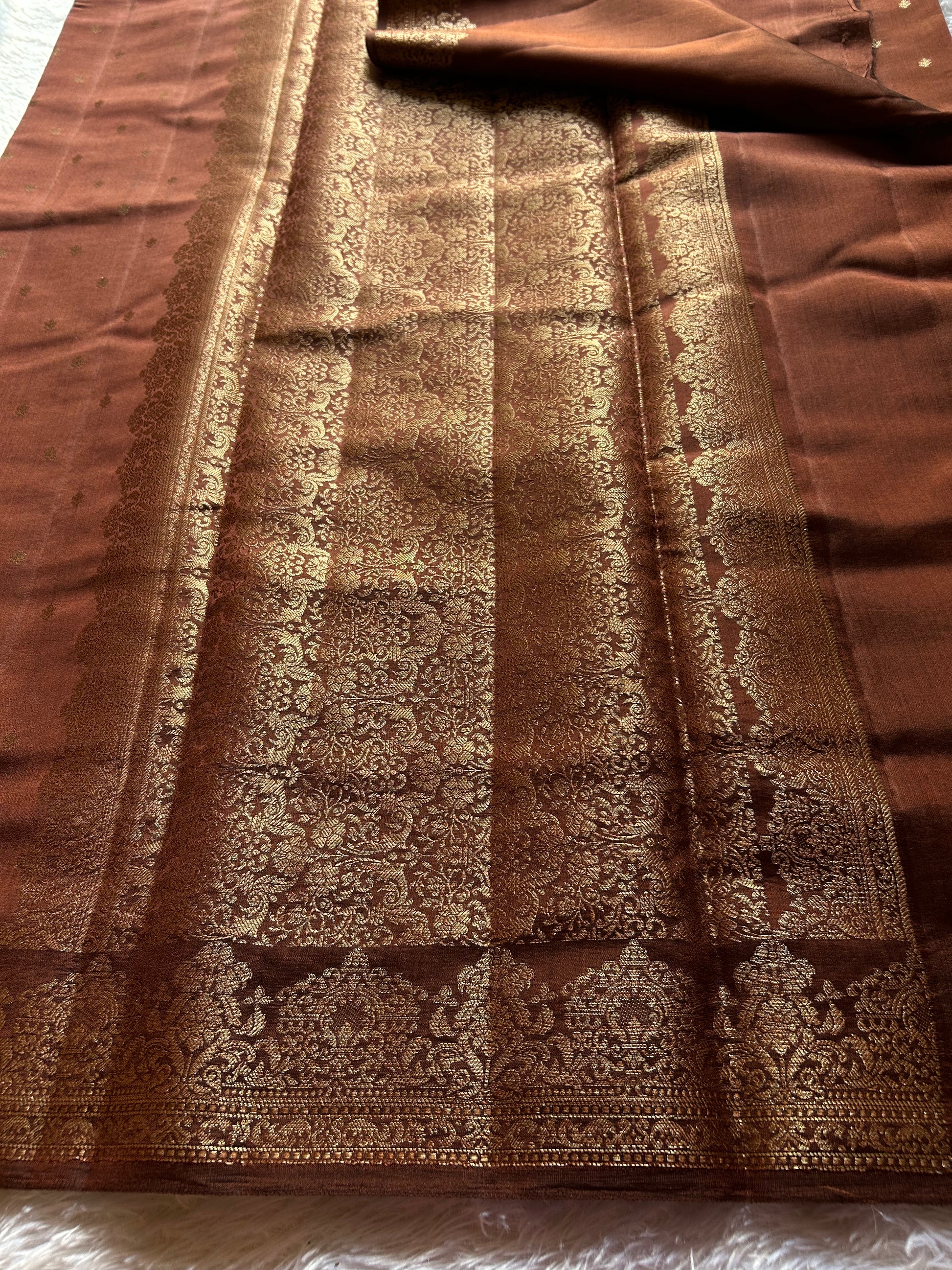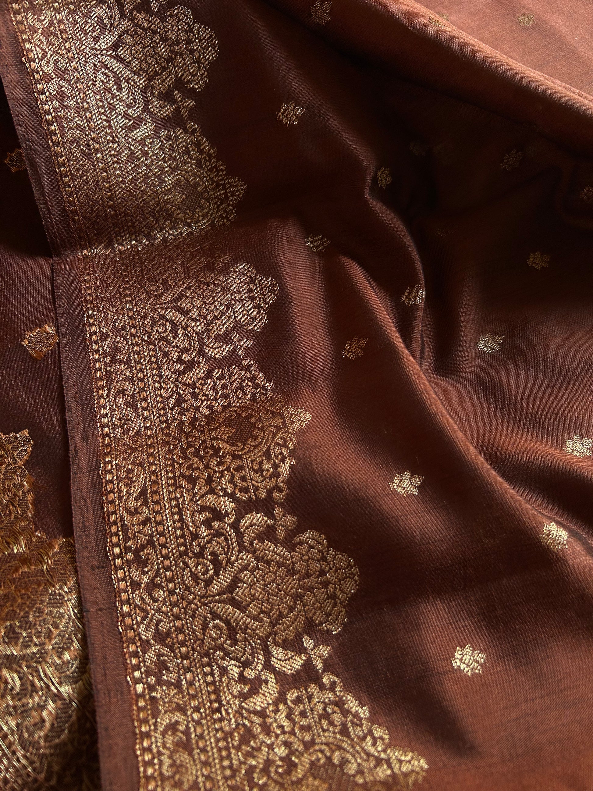 Elevate your ethnic wardrobe with this exquisite bronze brown Banarasi Chiniya silk saree, a masterpiece of traditional craftsmanship. Crafted from pure silk, this saree features delicate zari floral buttas scattered across the entire fabric, creating an understated yet sophisticated aesthetic. The pallu and border showcase intricate Banarasi zari work, displaying the hallmark precision and artistry this weaving tradition is renowned for. The rich bronze brown hue offers versatility for both festive occasions and formal gatherings, while the lustrous silk drape ensures graceful movement. Perfect for those who appreciate authentic handwoven textiles and timeless elegance.