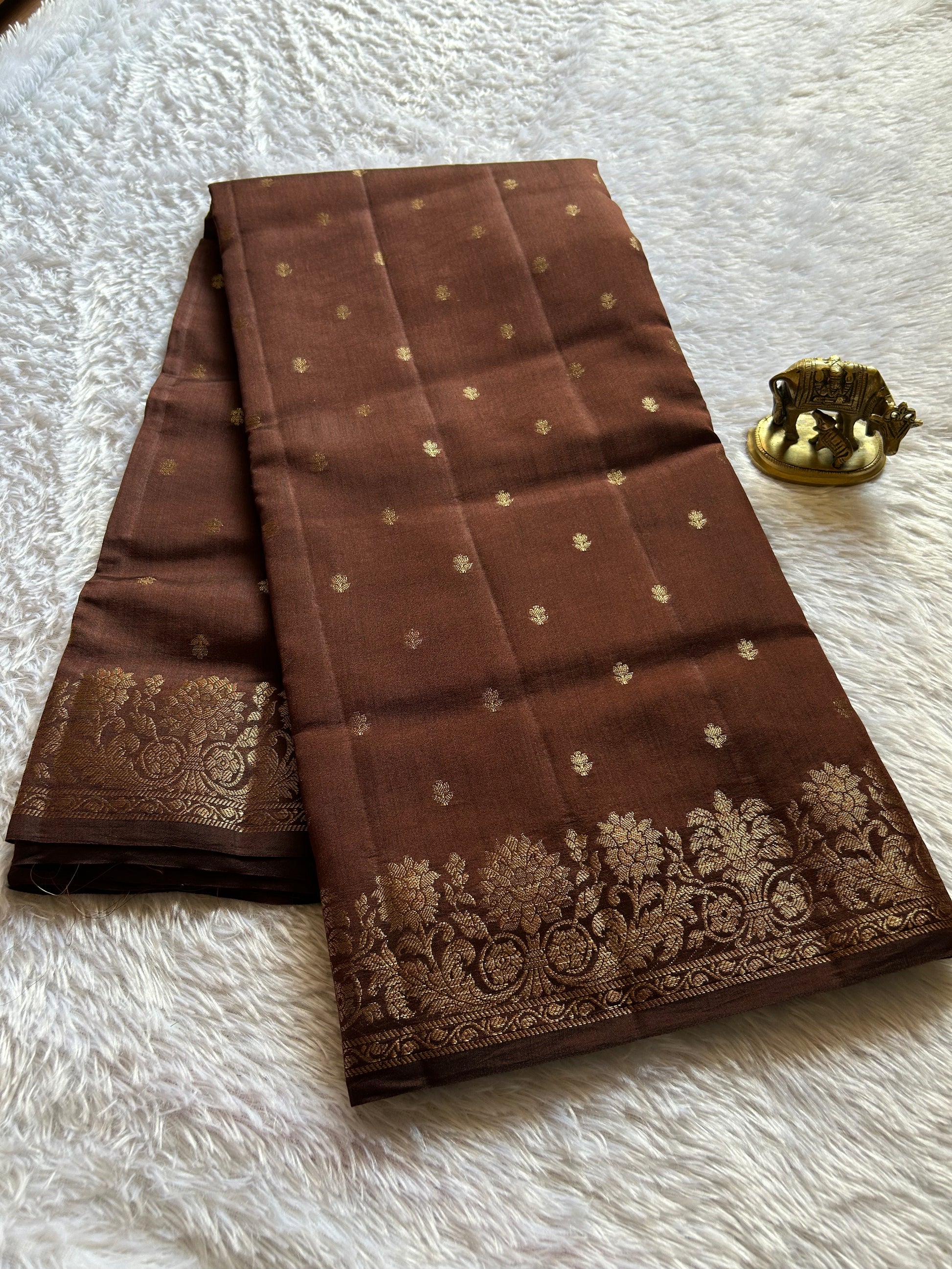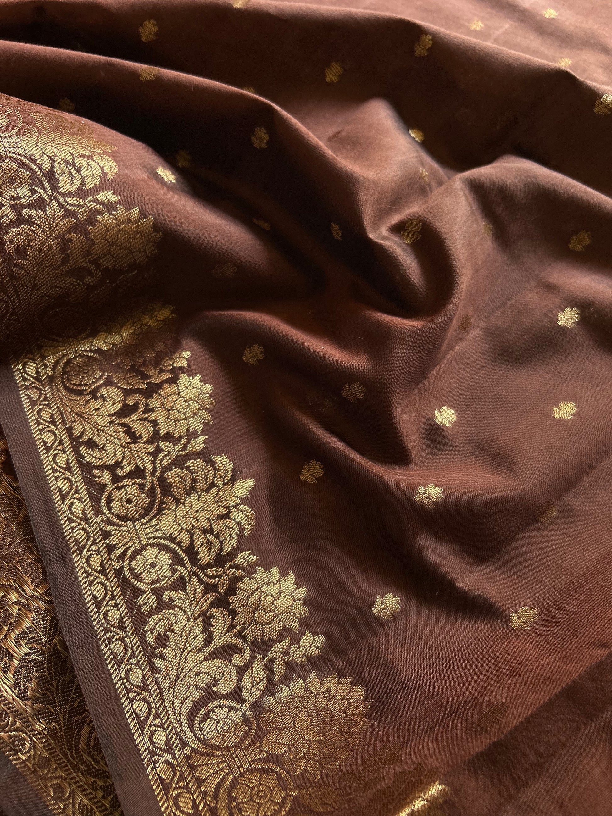 Elevate your ethnic wardrobe with this exquisite deep brown Banarasi chiniya silk saree, a masterpiece of traditional weaving craftsmanship. The fabric showcases intricate zari floral buttas meticulously scattered throughout, creating an understated yet sophisticated aesthetic. The pallu and border feature elaborate Banarasi zari designs that command attention with their ornate detailing and lustrous finish. Crafted from premium chiniya silk, this saree drapes beautifully while maintaining its structure, making it an ideal choice for weddings, festivals, and formal occasions. The rich brown tone pairs effortlessly with traditional jewelry and complements various skin tones, ensuring timeless elegance with every wear.