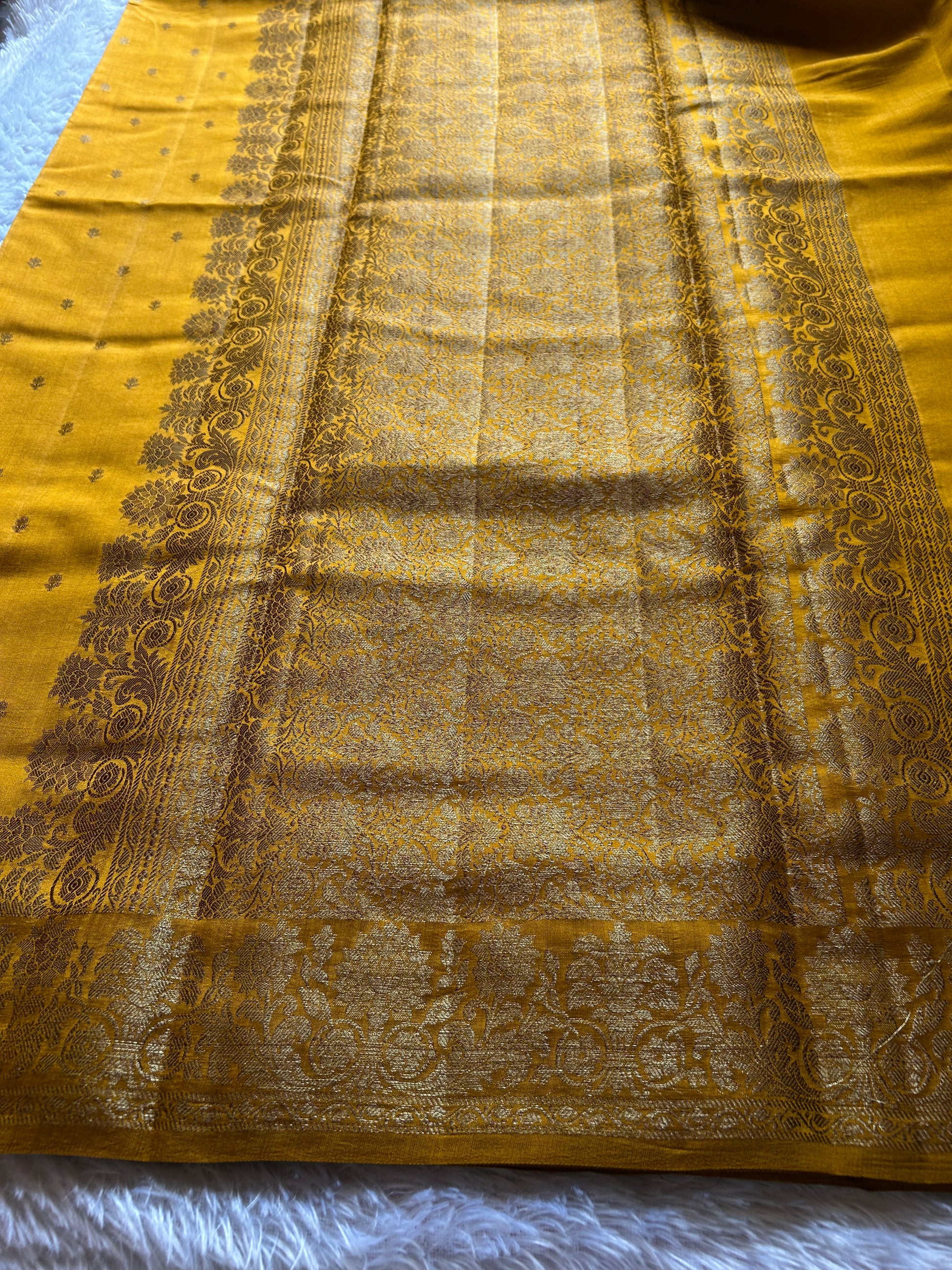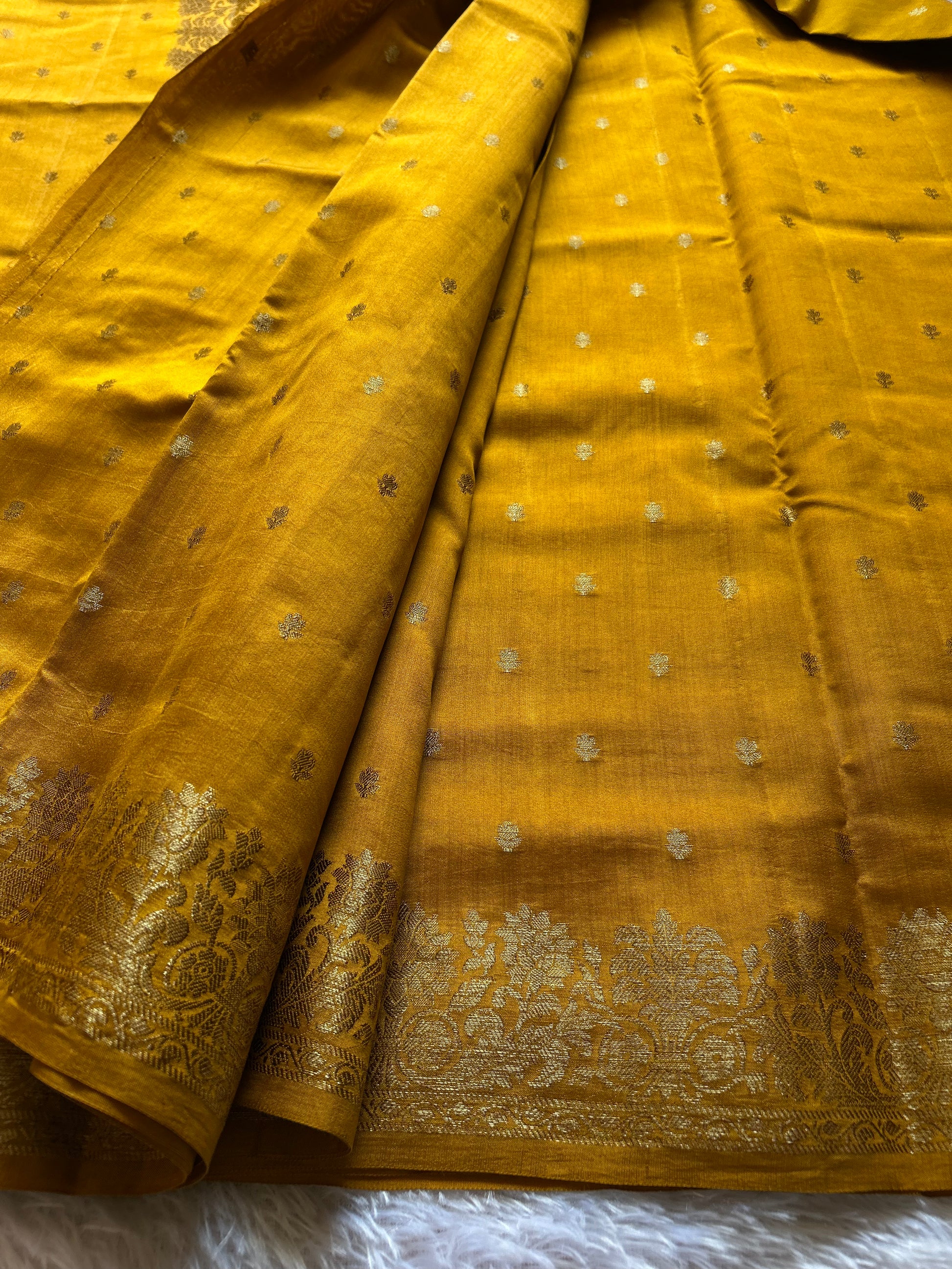 Elevate your ethnic wardrobe with this exquisite golden yellow Banarasi chiniya silk saree, a masterpiece of traditional craftsmanship. Woven from pure silk, this saree features delicate zari floral buttas meticulously scattered across the fabric, creating an understated yet sophisticated aesthetic. The pallu and border showcase intricate Banarasi zari work, displaying the hallmark precision and artistry Banarasi looms are renowned for. The luminous golden yellow hue complements all skin tones, making it an ideal choice for weddings, festivals, and formal occasions. Perfect for those who appreciate authentic handwoven textiles and timeless elegance.
