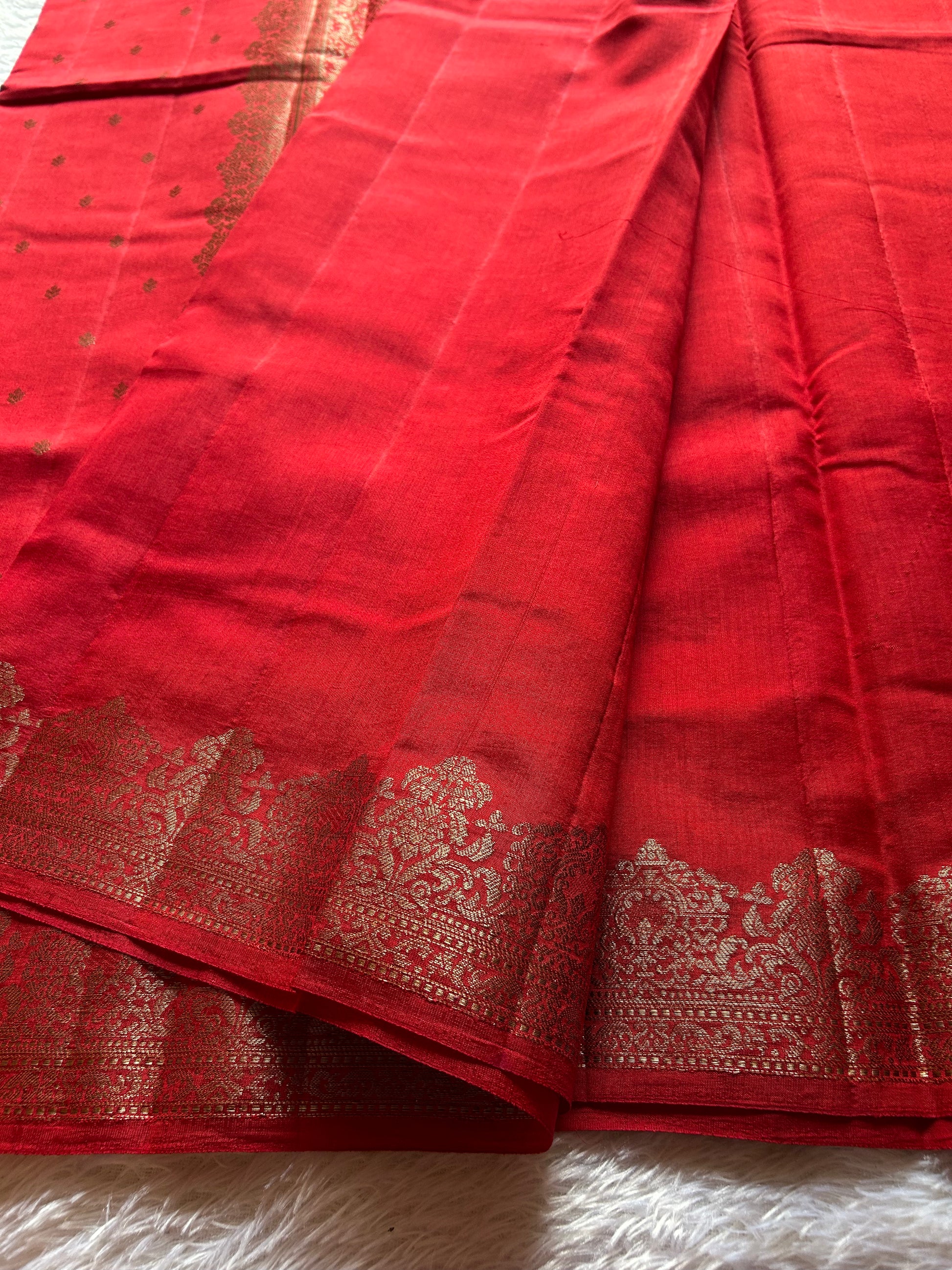 Elevate your ethnic wardrobe with this exquisite red Banarasi Chiniya silk saree, a masterpiece of traditional weaving craftsmanship. Crafted from premium silk, this saree features delicate zari floral buttas scattered across the entire fabric, creating an intricate and sophisticated aesthetic. The pallu and border showcase elaborate Banarasi zari work with ornate detailing that captures the essence of timeless elegance. Perfect for weddings, festivals, and special occasions, this saree combines the lightweight comfort of Chiniya silk with the opulent grandeur of authentic Banarasi embellishment. A versatile investment piece that transcends seasons and trends.