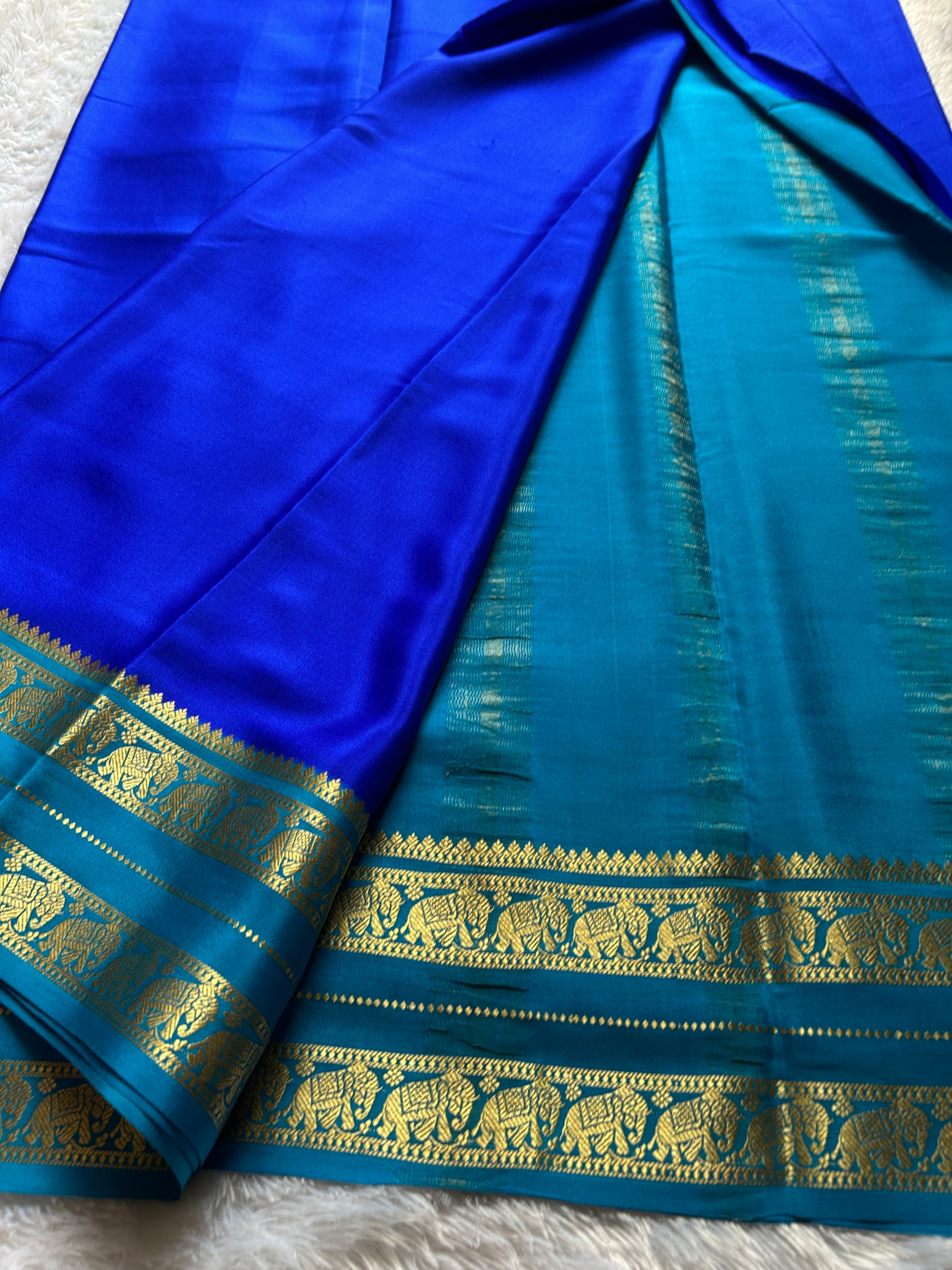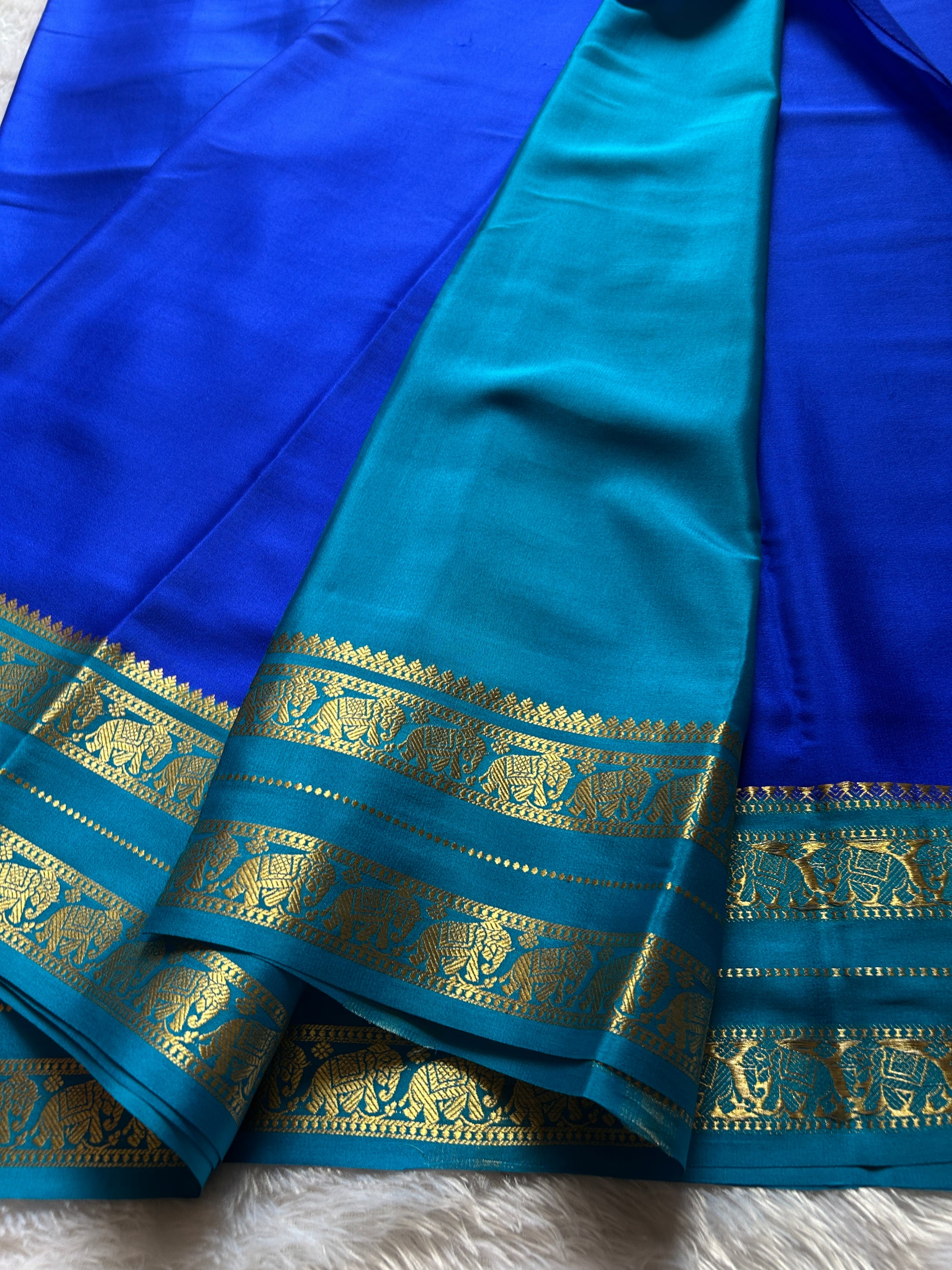 Bheema (2D) showcases the timeless elegance of pure Mysore crepe silk in a striking royal blue. This saree features an exquisite ananda blue gap border adorned with intricate zari elephant motifs—a design that celebrates traditional craftsmanship. The luxurious drape of Mysore crepe silk combined with the sophisticated color palette and detailed embellishment makes this piece ideal for formal occasions and celebrations. The elephant motifs symbolize grace and strength, adding cultural significance to your wardrobe. A refined choice for those who appreciate authentic silk sarees with masterful artisanal detailing.