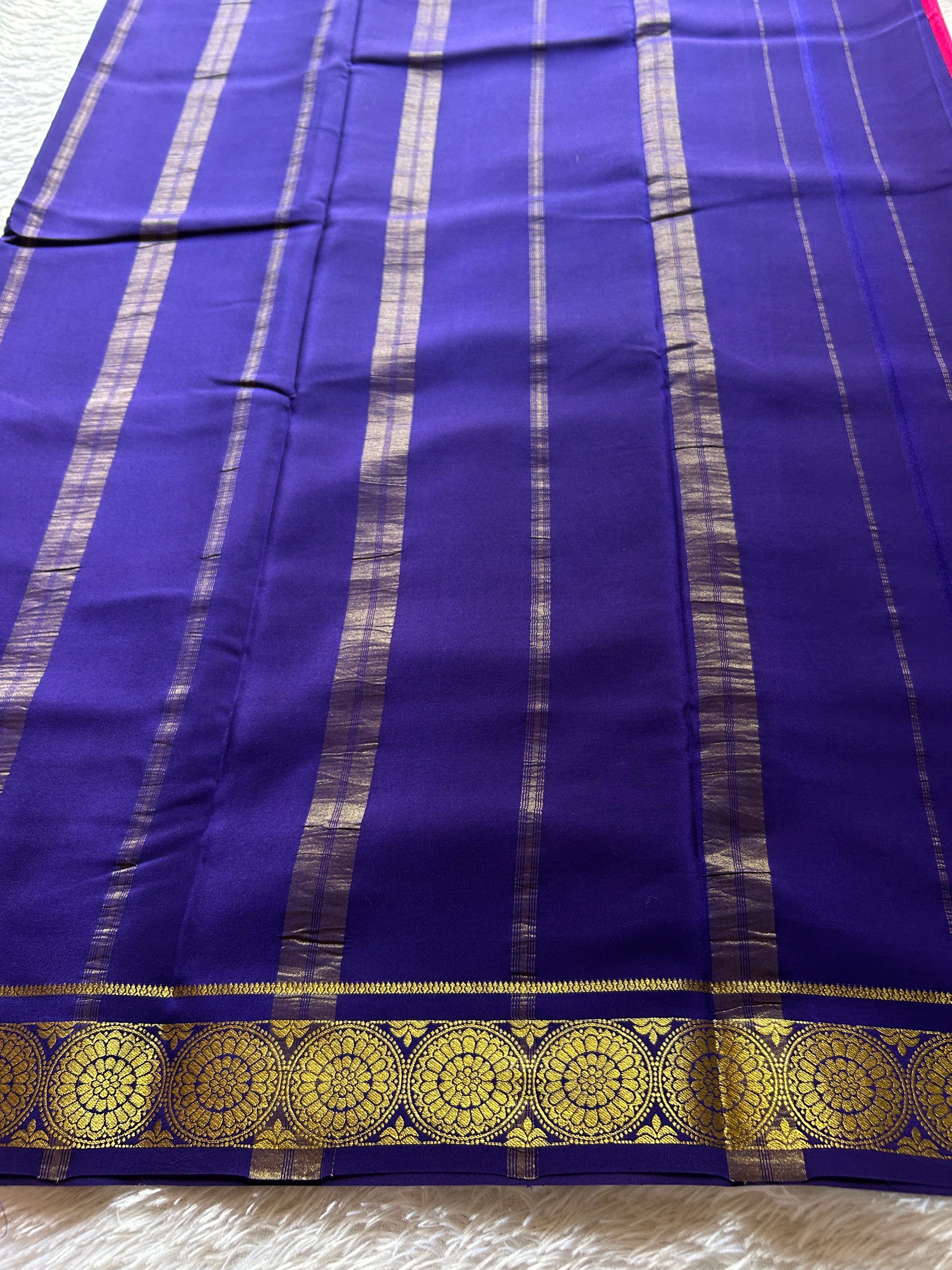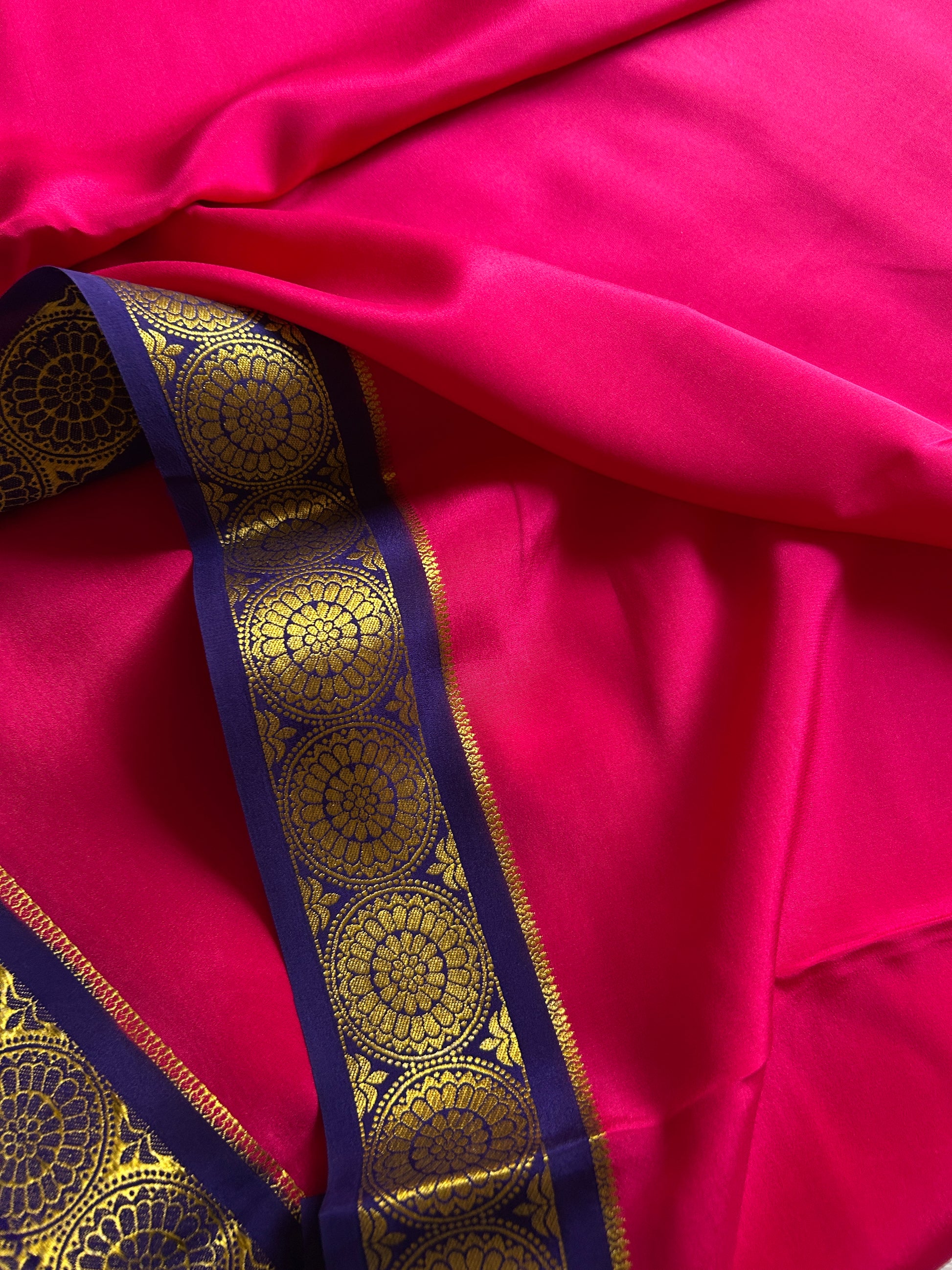 Elevate your ethnic wardrobe with this exquisite pink Mysore crepe silk saree, crafted from premium 100 GSM fabric that drapes with refined elegance. The striking navy blue border features an intricate chakra design meticulously embellished with CSS (copper silver silk) zari, creating a sophisticated geometric pattern that commands attention. The lightweight crepe texture ensures comfortable all-day wear while maintaining its graceful silhouette. Perfect for festive occasions, celebrations, or formal gatherings, this saree seamlessly blends traditional artistry with contemporary aesthetics. An investment piece that reflects timeless craftsmanship and refined taste.