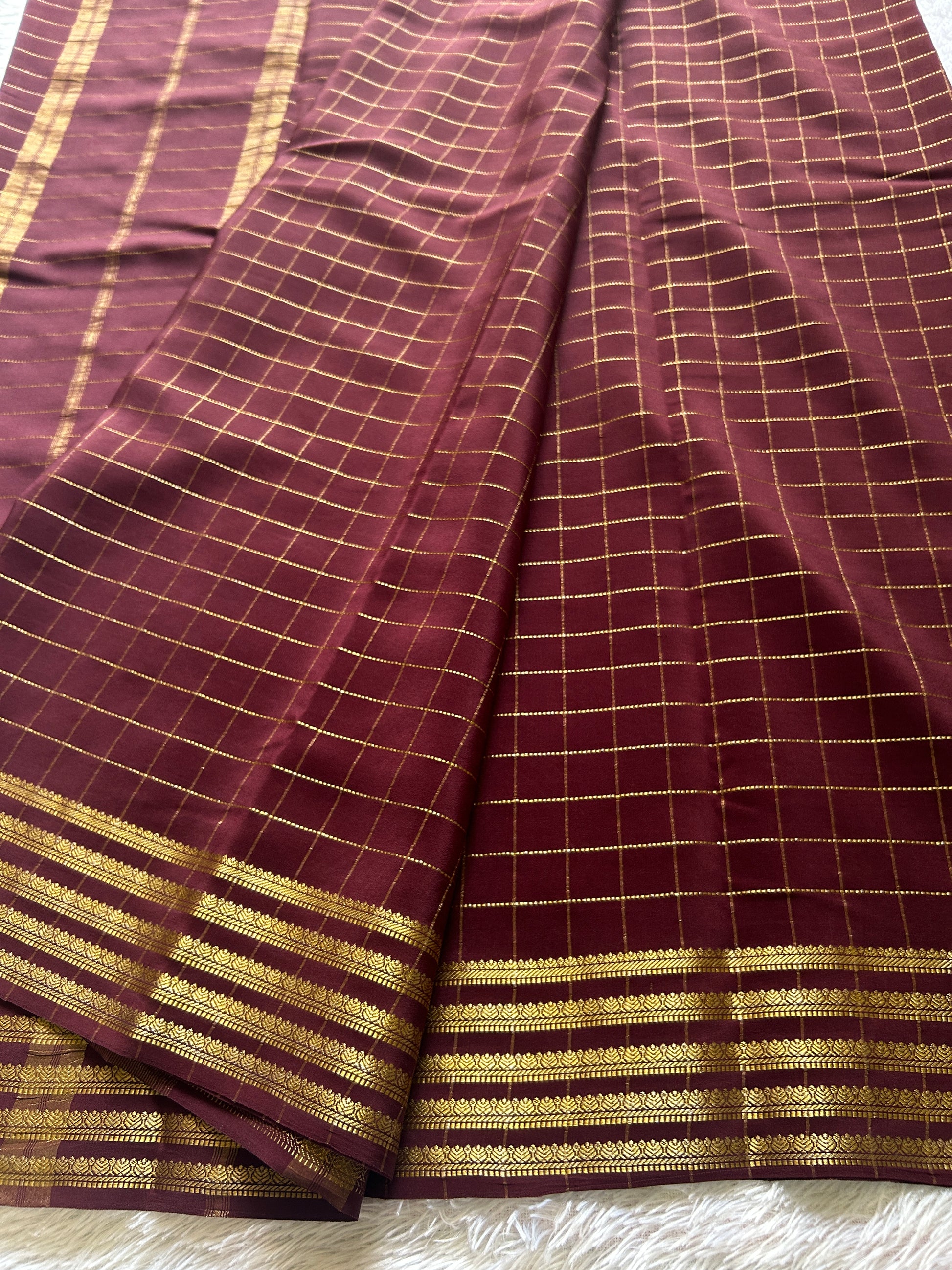 This brown Mysore crepe silk saree, crafted from 110 GSM pure silk, features elegant zari checks across its body, enhancing its textured appeal. Its rich floral lines zari border adds a timeless sophistication, making it an exquisite choice for both traditional and formal occasions. The lightweight fabric ensures comfortable draping while maintaining a luxurious finish. Perfect for those seeking classic beauty with subtle yet striking detailing.