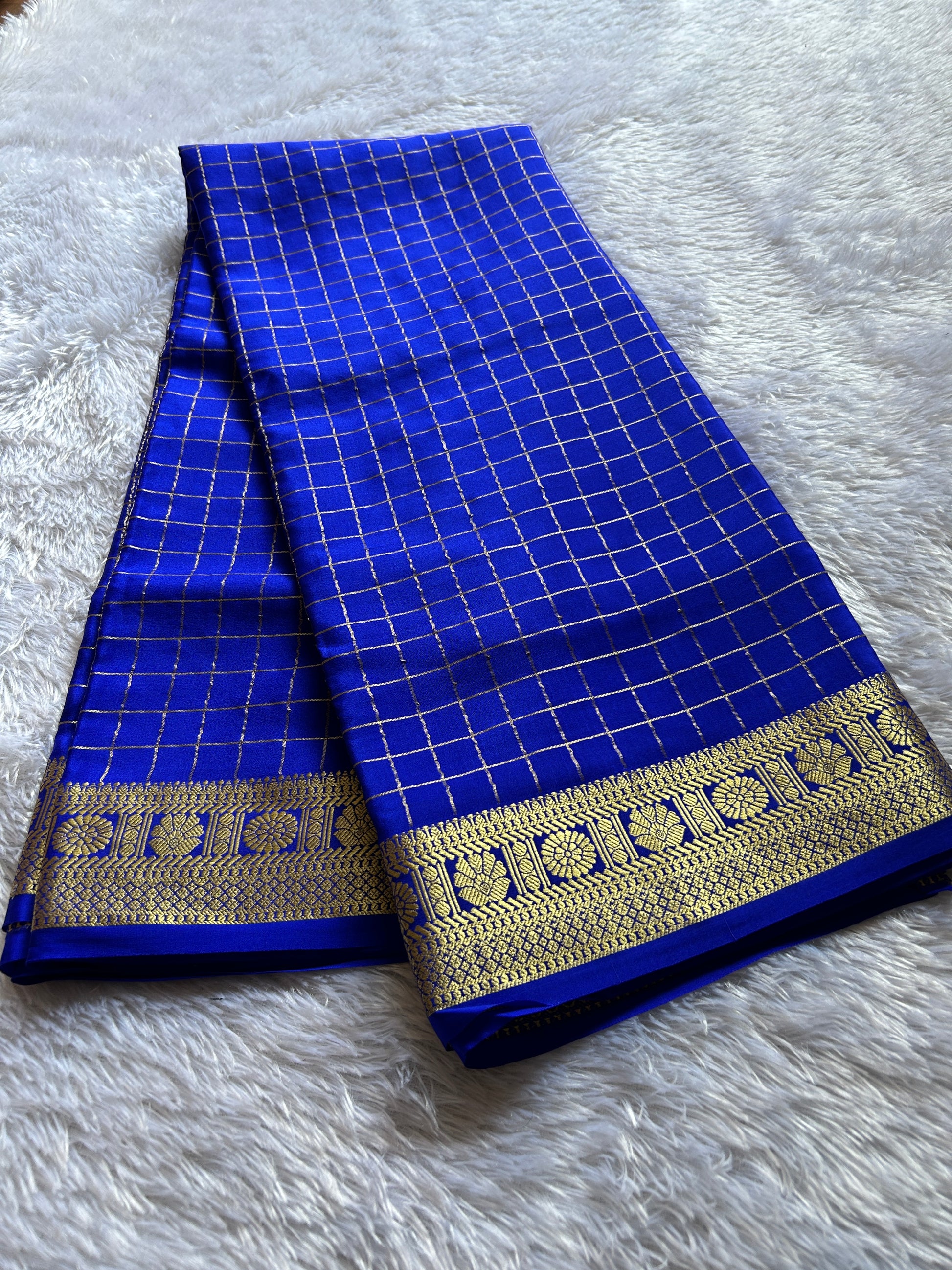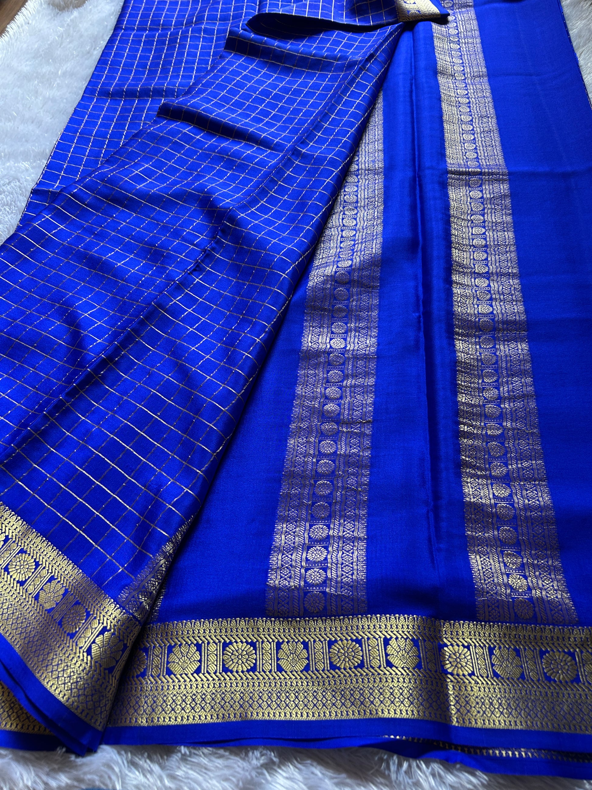 This exquisite Mysore crepe silk saree in a roral blue hue features delicate zari checks woven throughout, adding subtle texture and elegance. Its traditional zari border enhances the saree’s timeless appeal, making it perfect for formal occasions and cultural celebrations. Crafted with expert precision, this saree combines classic design with luxurious fabric for a graceful drape and lasting comfort.