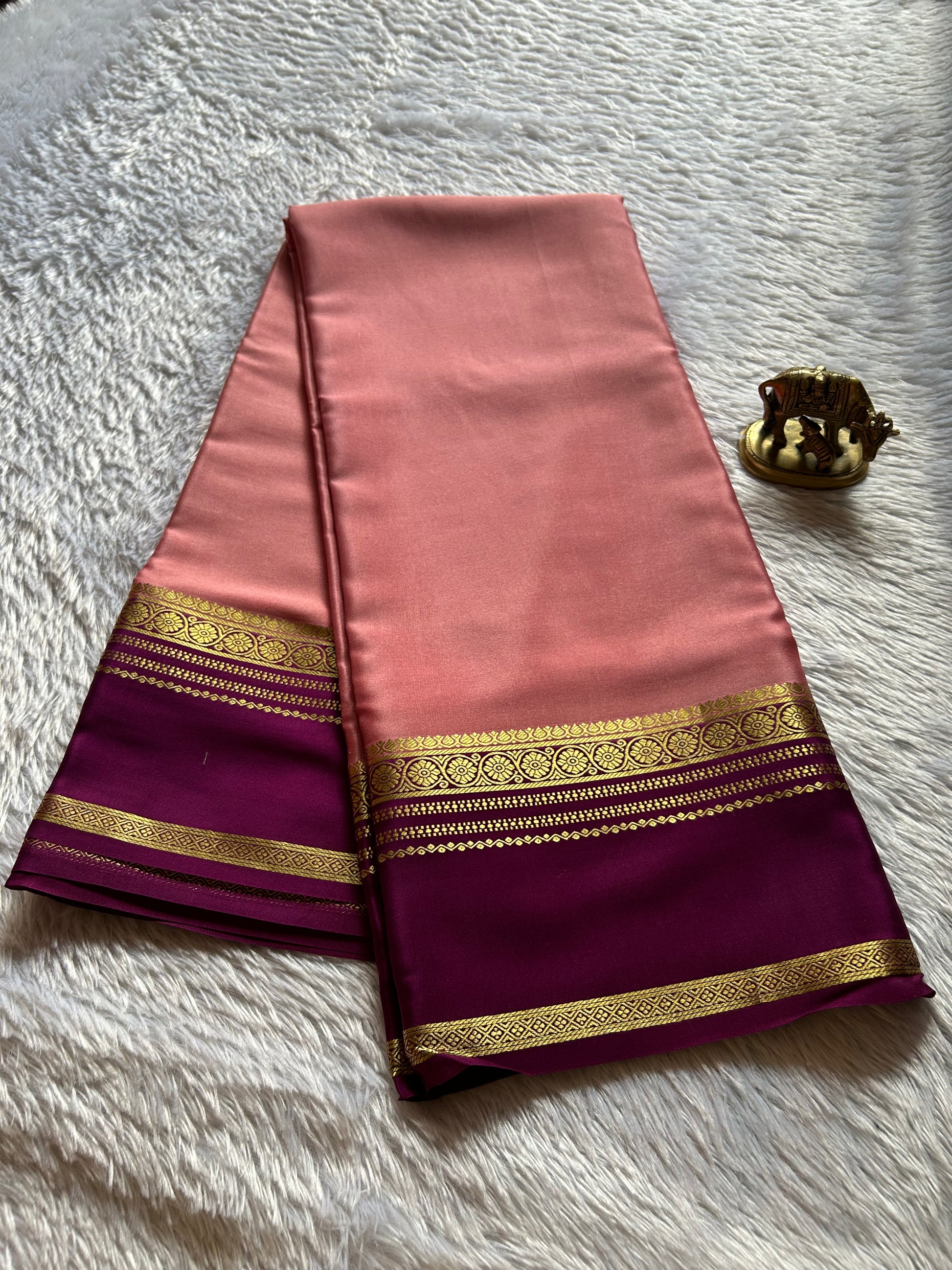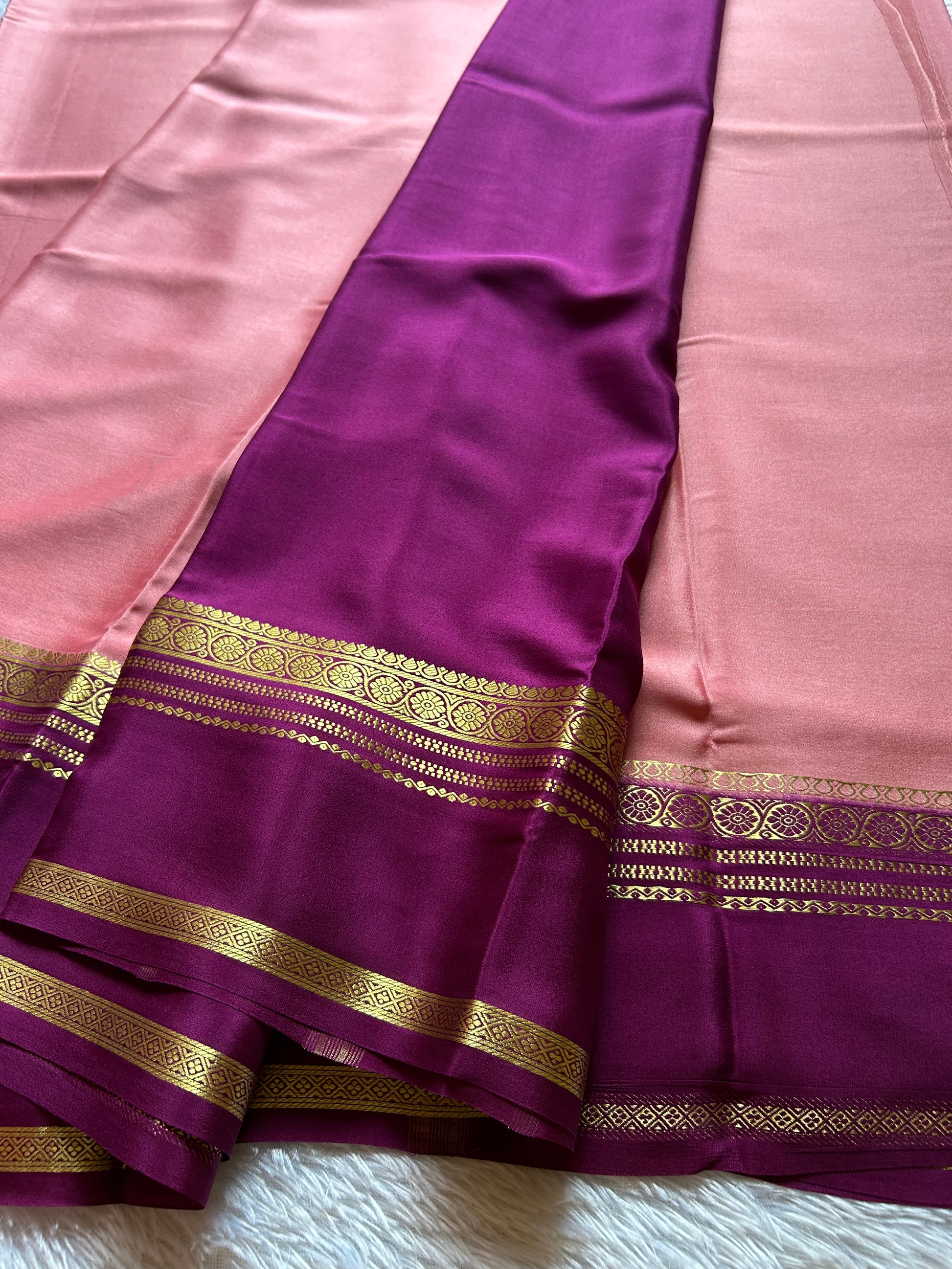 Daamini presents an exquisite blend of sophistication and artisanal craftsmanship. This blush pink Mysore crepe silk saree features a luxuriously fluid drape characteristic of premium crepe weaves, offering both comfort and elegance for formal occasions. The striking magenta gap border, enriched with intricate zari work, creates a refined contrast that elevates the understated beauty of the base fabric. The interplay between the soft blush tone and vibrant magenta detailing makes this piece versatile for weddings, celebrations, and refined gatherings. Mysore silk's natural sheen and durability ensure this saree remains a timeless addition to your collection.