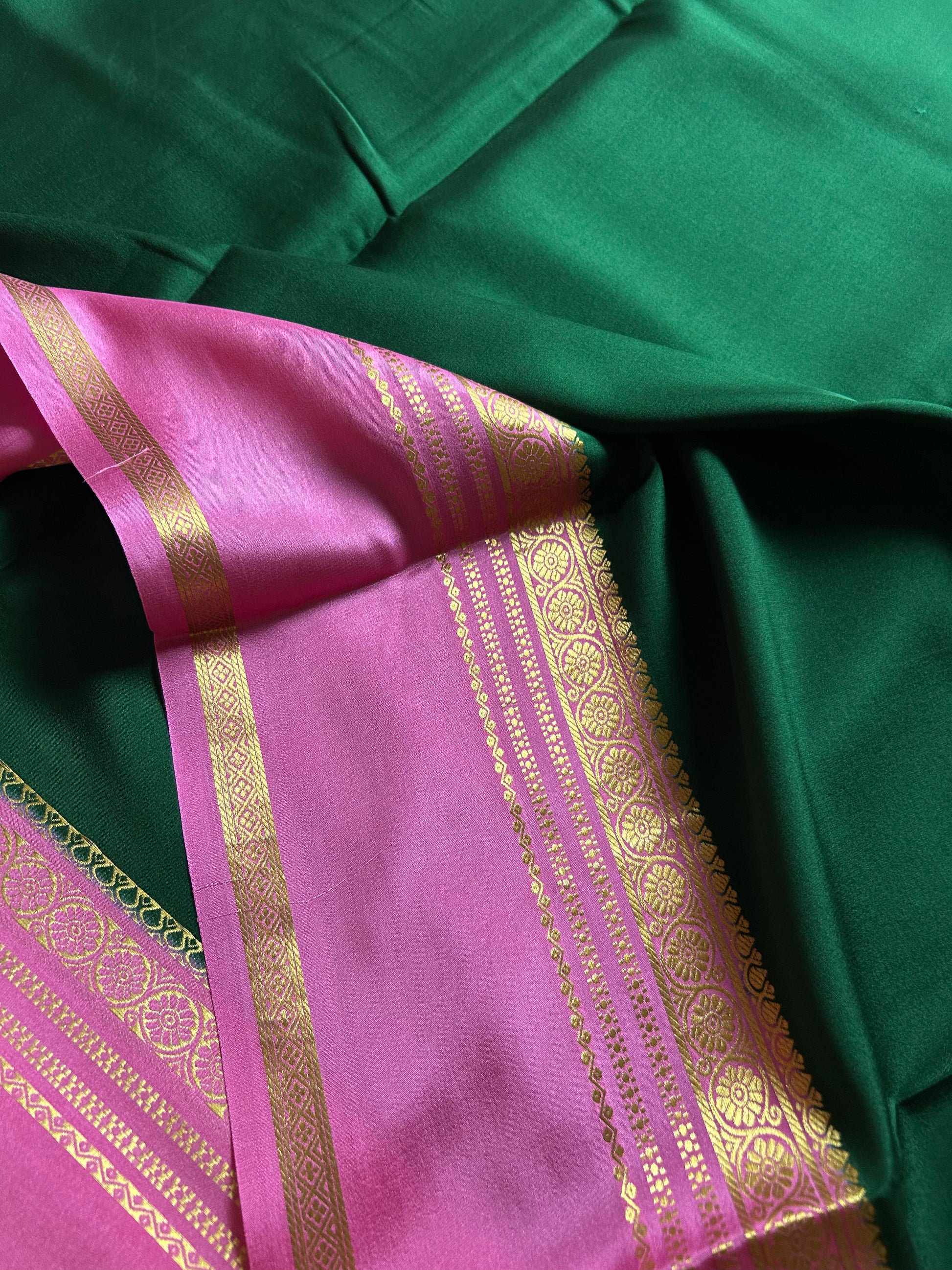 Elevate your ethnic wardrobe with this exquisite Mysore crepe silk saree in deep forest green. The luxurious pure silk fabric drapes beautifully with a subtle texture that enhances movement and comfort. A delicate baby pink gap border adorned with intricate zari work adds a contemporary contrast, creating a sophisticated interplay of colors. The refined craftsmanship and premium silk quality make this piece ideal for festive occasions, celebrations, and formal gatherings. Perfect for those who appreciate timeless elegance with modern sensibility.