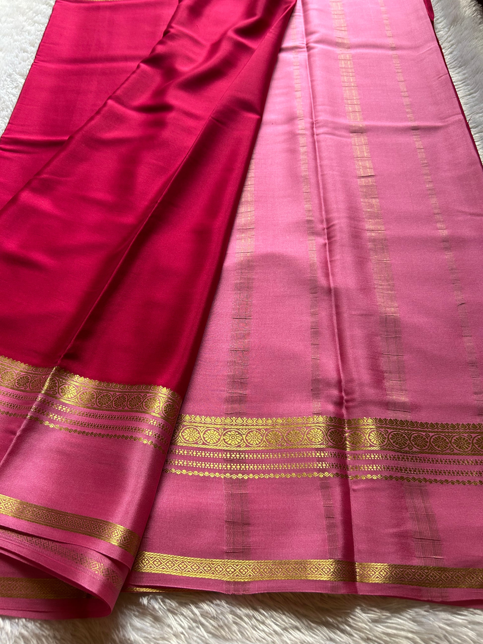 Elevate your ethnic wardrobe with this exquisite Mysore crepe silk saree in deep rose tones. The lustrous dark pink body showcases the natural sheen characteristic of pure silk, while a delicate baby pink gap border adorned with intricate zari work adds refined sophistication. The fine crepe texture ensures graceful draping and comfortable wear throughout the day. Perfect for festive occasions, celebrations, and formal gatherings, this timeless piece combines traditional craftsmanship with contemporary elegance. The contrast between the rich base and embellished border creates a striking visual appeal that complements various skin tones and personal styles.