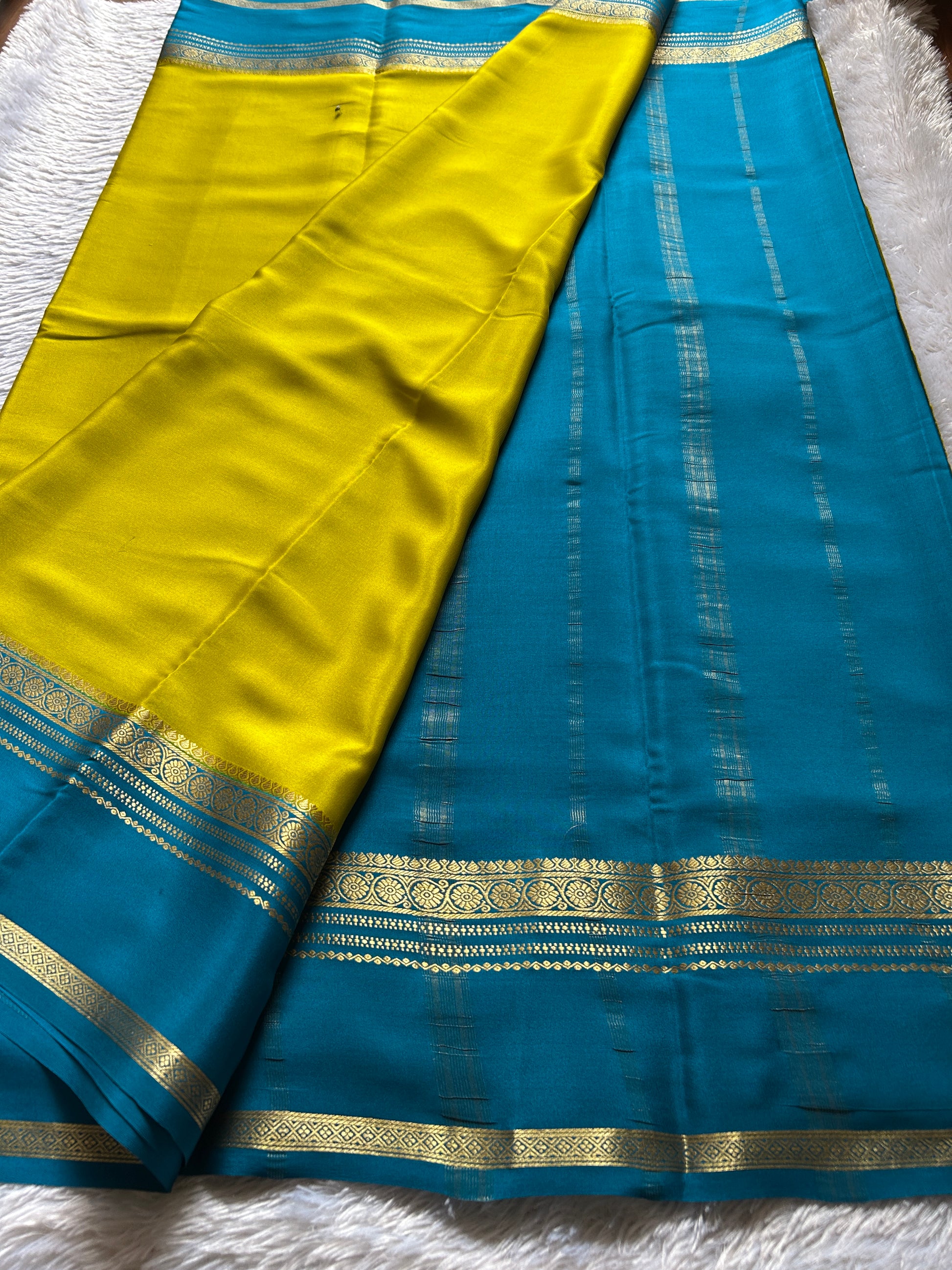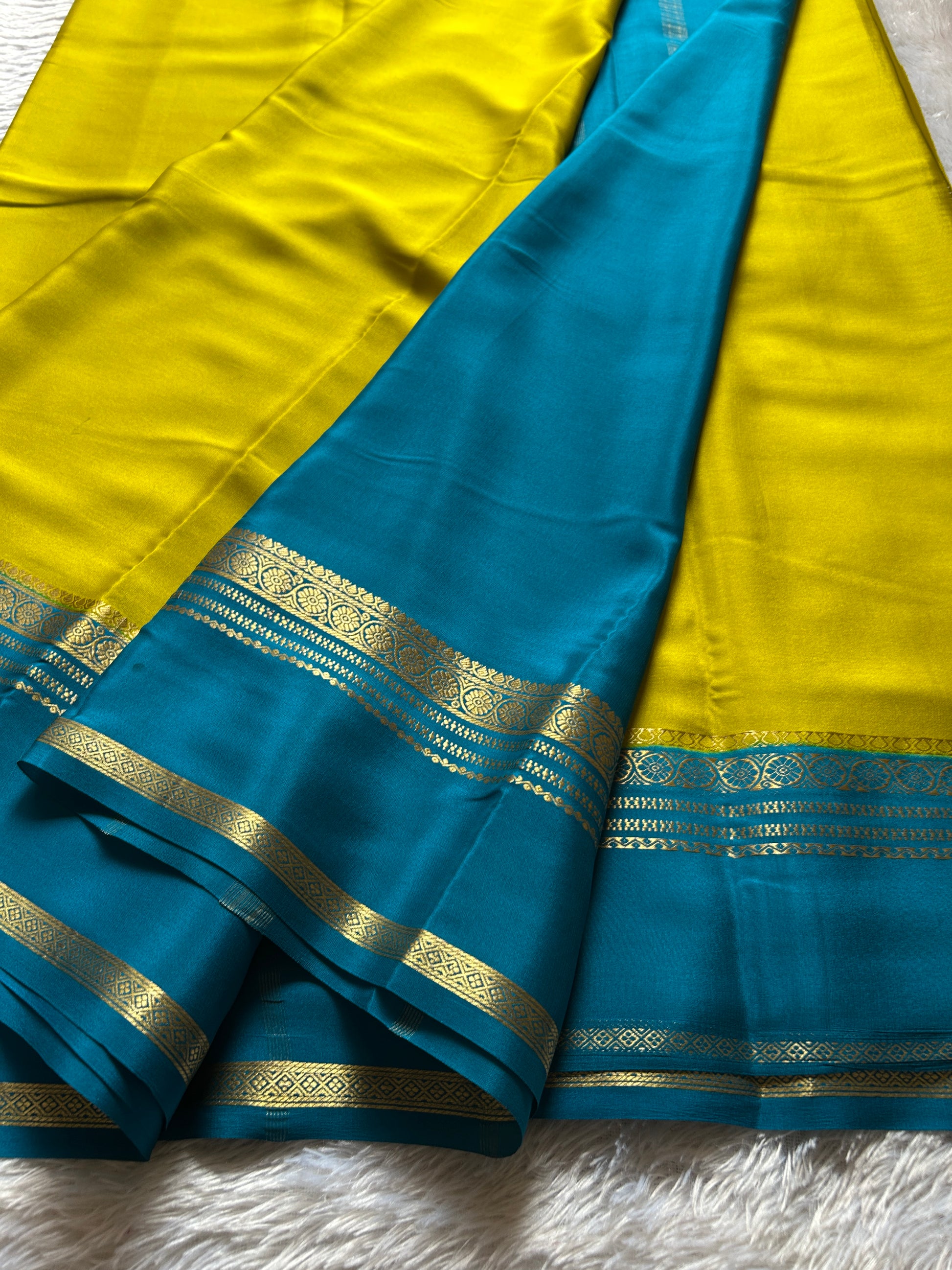 This distinguished olive pure Mysore silk saree features a traditional teal blue gap border enhanced with precise zari craftsmanship. The premium silk exhibits characteristic luster and drape, while the contrasting blue border creates a striking visual balance. Meticulously woven with gold-infused threads, the intricate zari work demonstrates the pinnacle of South Indian textile artistry, ideal for connoisseurs seeking authentic ceremonial attire with historical significance.