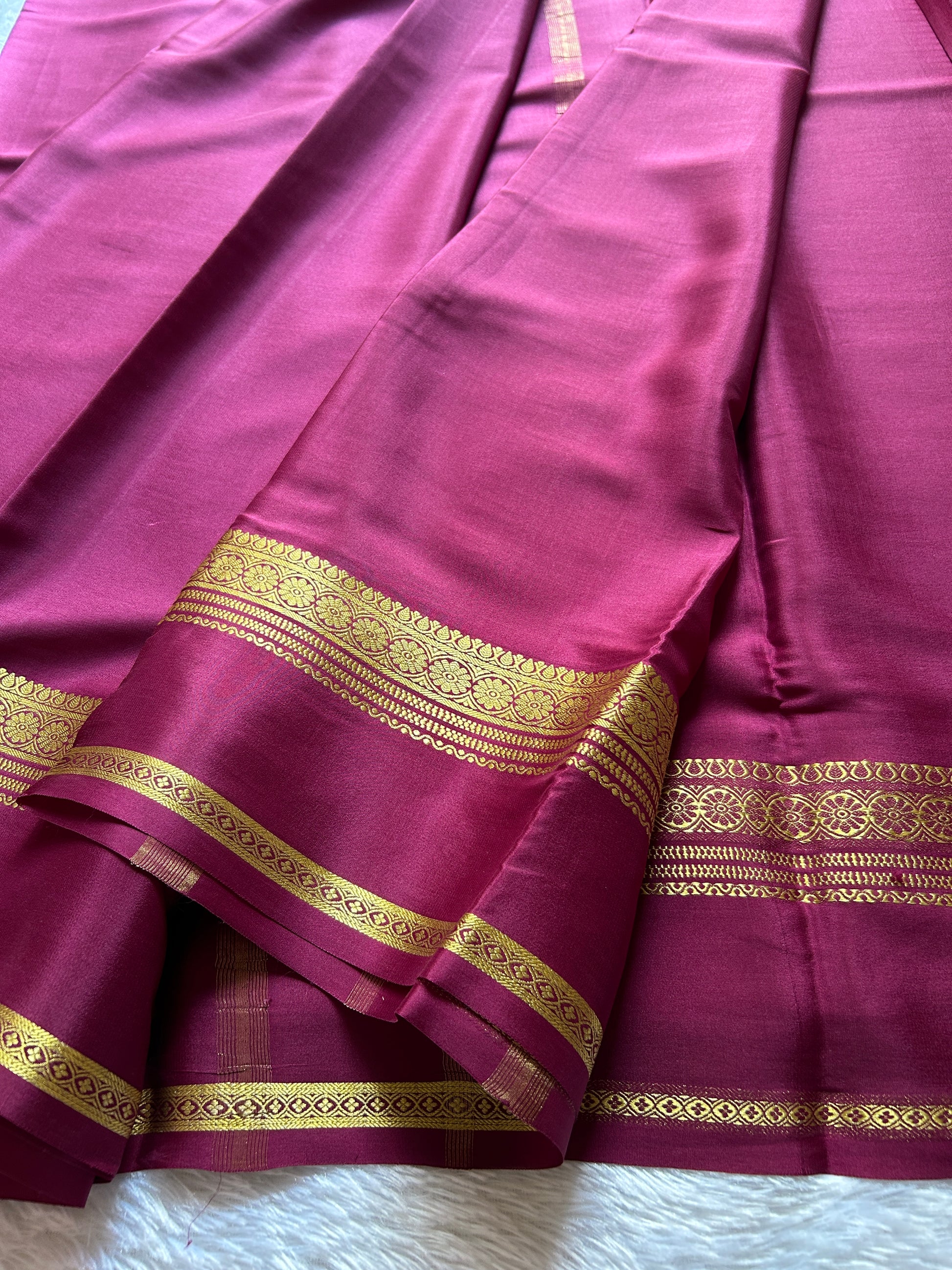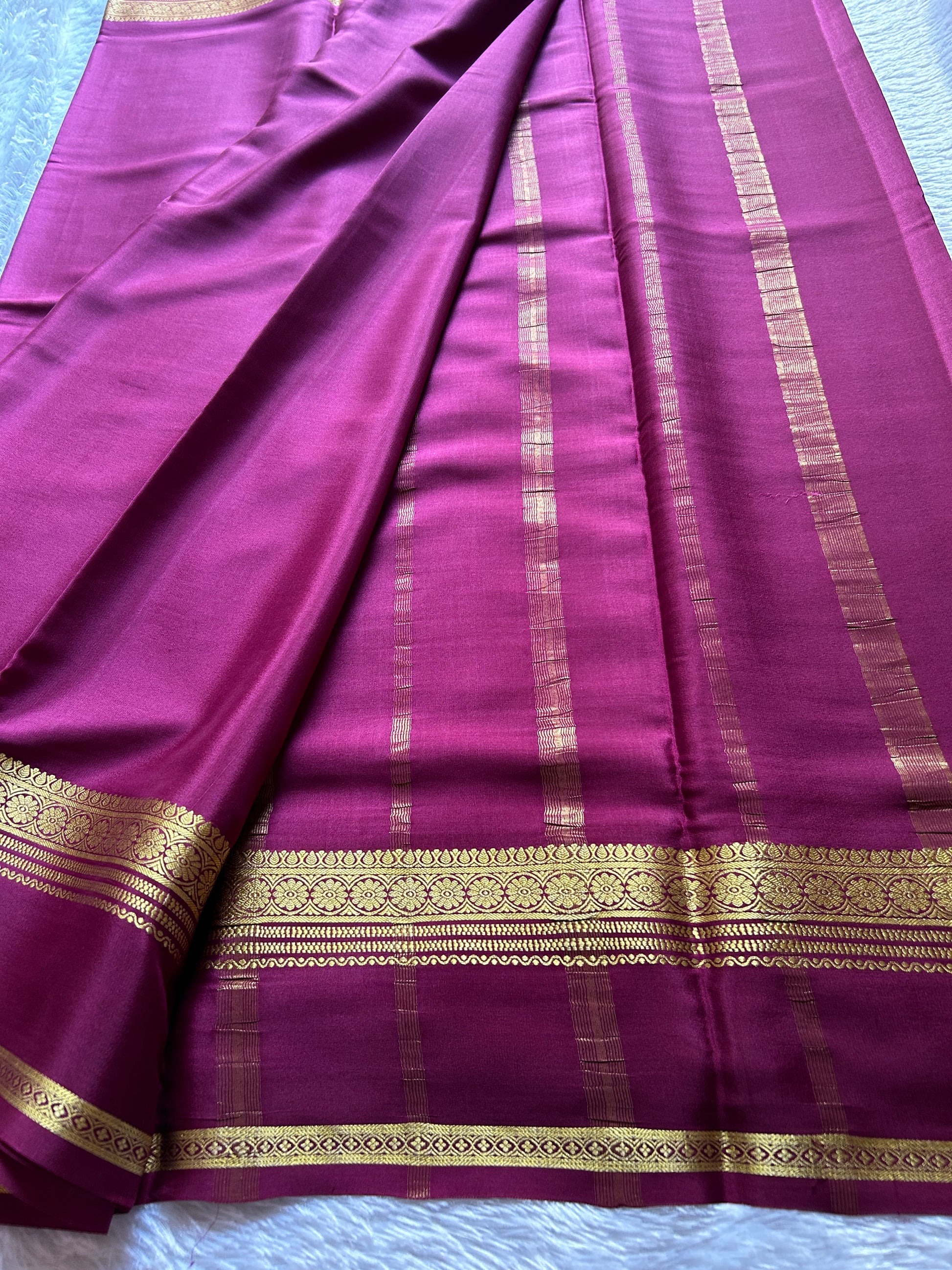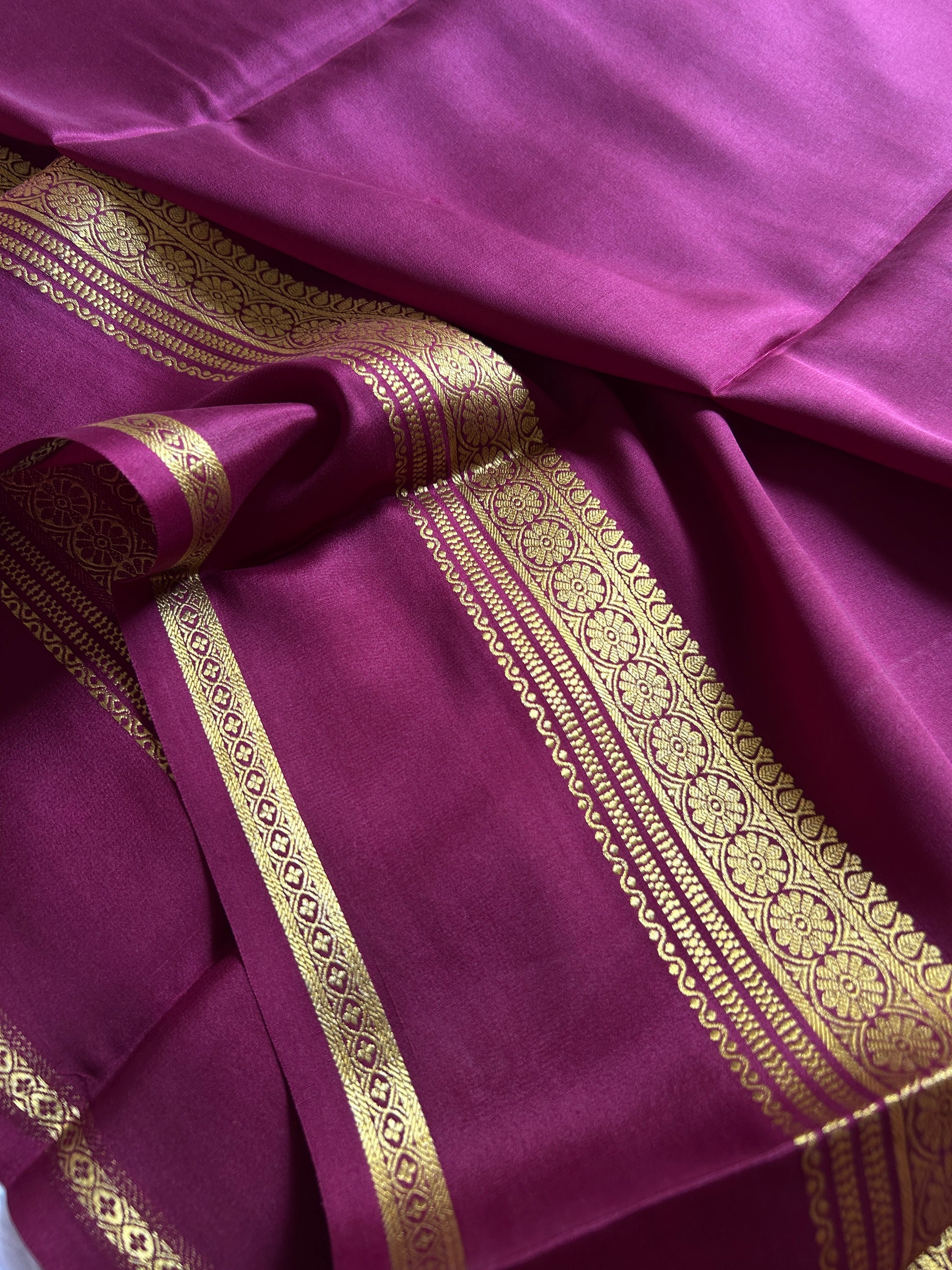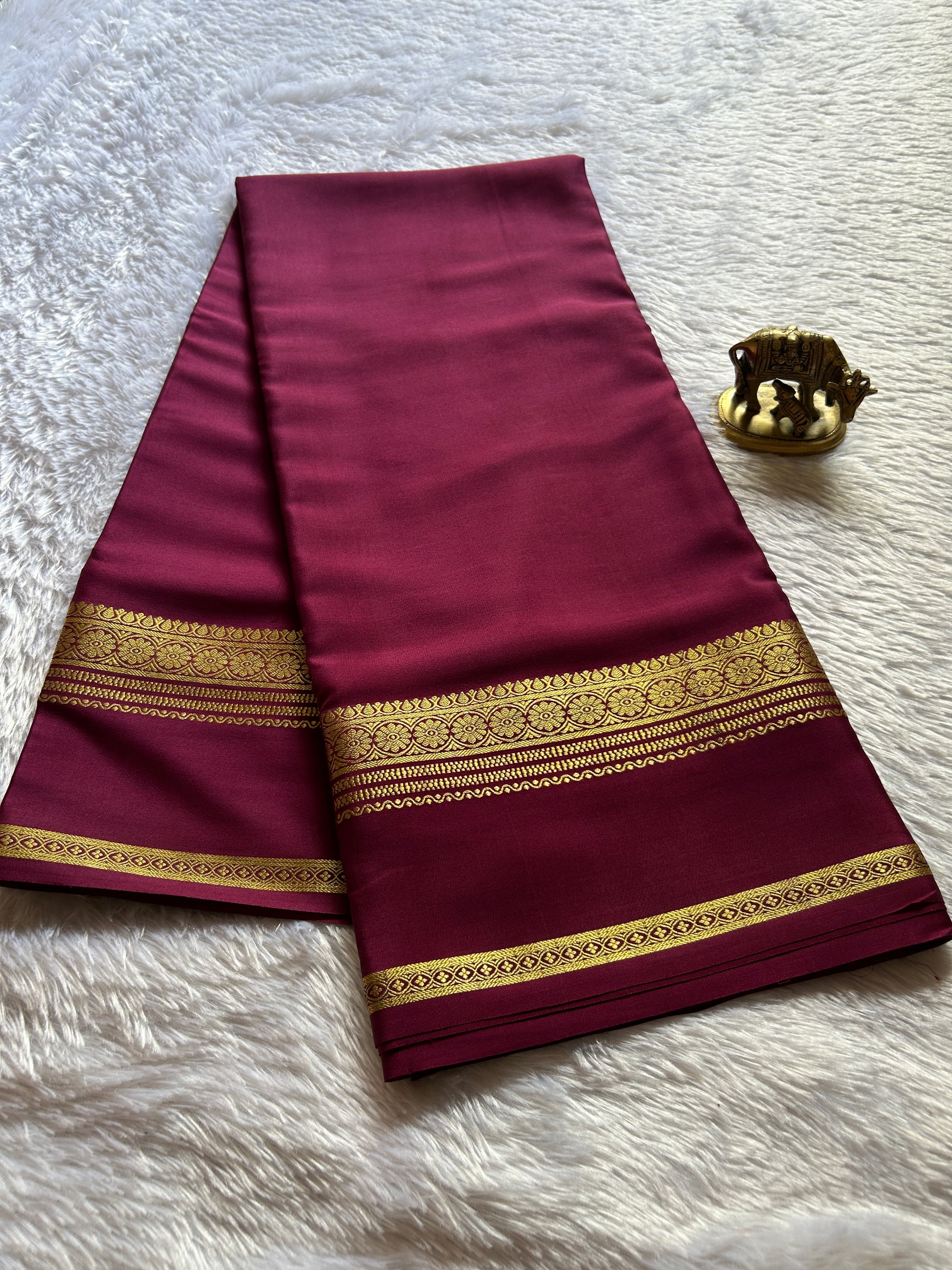 This wine saree showcases the timeless elegance of pure Mysore crepe silk. Its smooth texture and rich hue are enhanced by a distinctive gap border adorned with intricate zari work, reflecting expert craftsmanship. Perfect for formal occasions, this saree combines traditional artistry with a graceful drape, making it a refined choice for those who appreciate heritage and sophistication.
