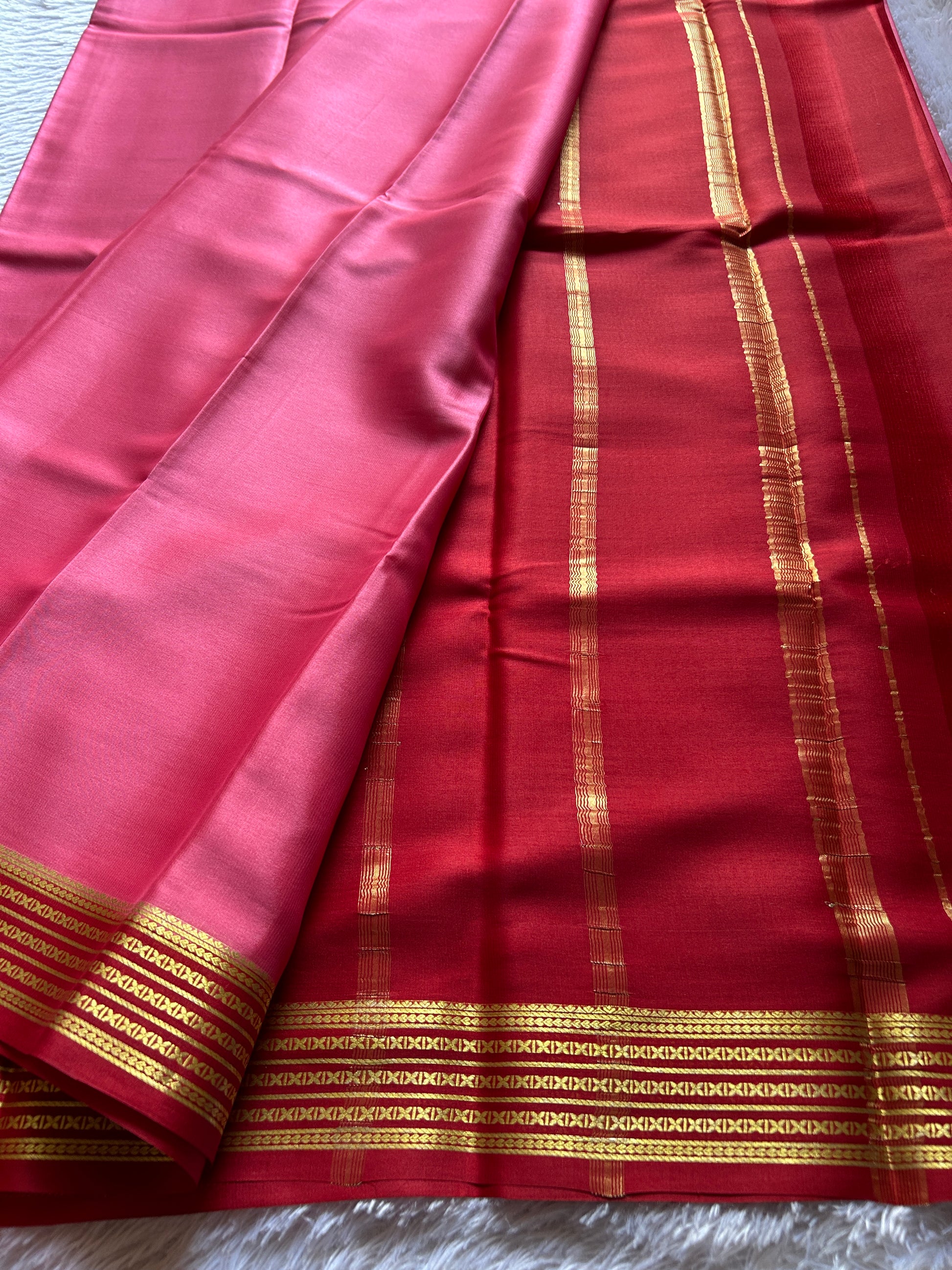 Deeksha presents an exquisite cranberry pink Mysore crepe silk saree, meticulously crafted from pure silk at an exceptionally lightweight 60 GSM. The fabric drapes with fluid elegance, offering comfort without compromising on structure. A striking red border frames the piece, adorned with classic zari work that adds timeless sophistication. This refined composition makes it ideal for both formal occasions and refined everyday wear, delivering the authentic luxury of traditional Mysore silk with contemporary lightness.