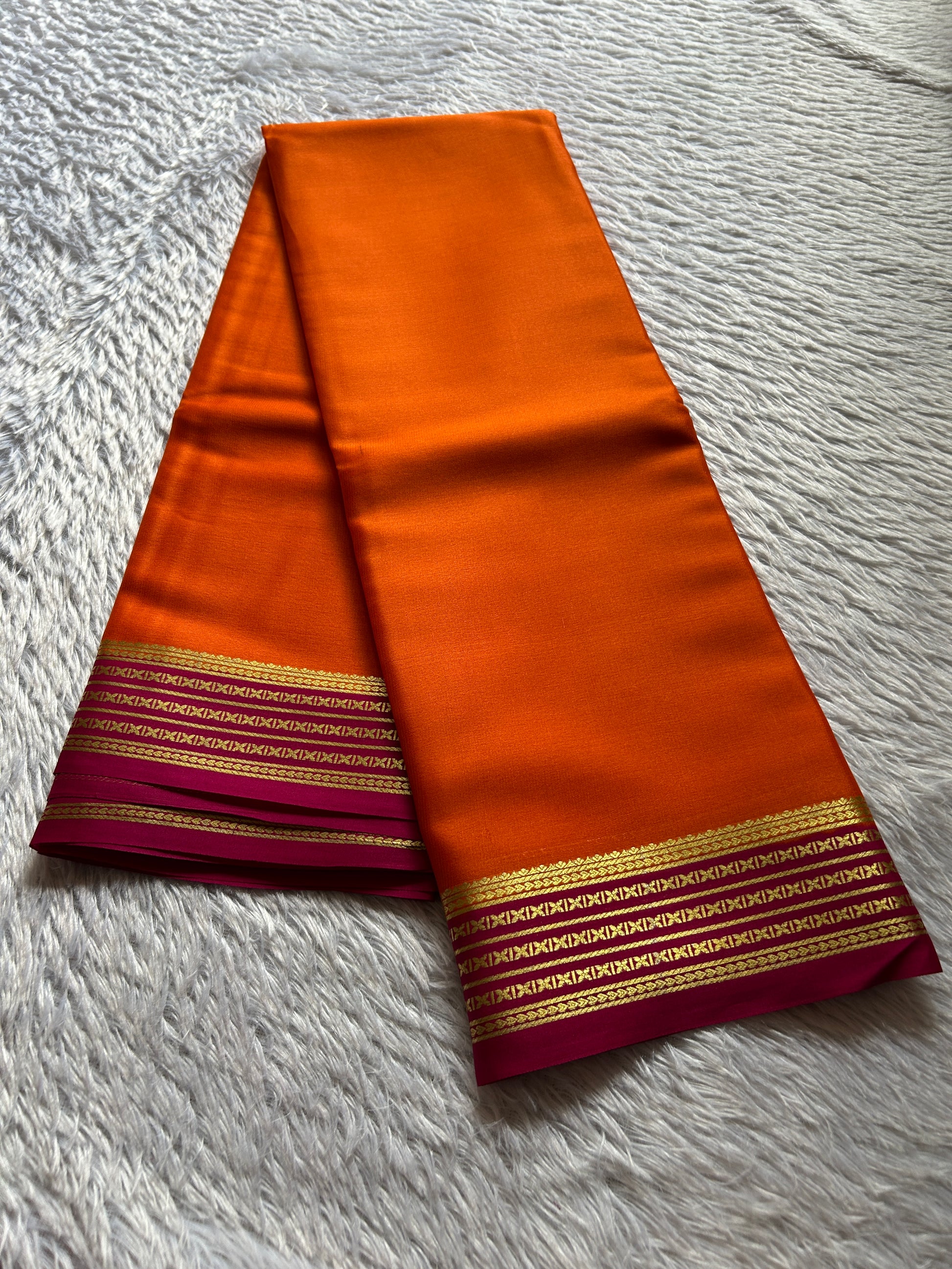 This Deeksha saree showcases a lightweight, pure Mysore crepe silk fabric at 60 GSM, offering exceptional comfort and graceful drape. The vibrant orange body contrasts elegantly with a delicate pink border, accentuated by intricate zari line work that highlights traditional craftsmanship. Ideal for sophisticated occasions, this saree blends luxurious texture with refined artistry for a timeless appeal.