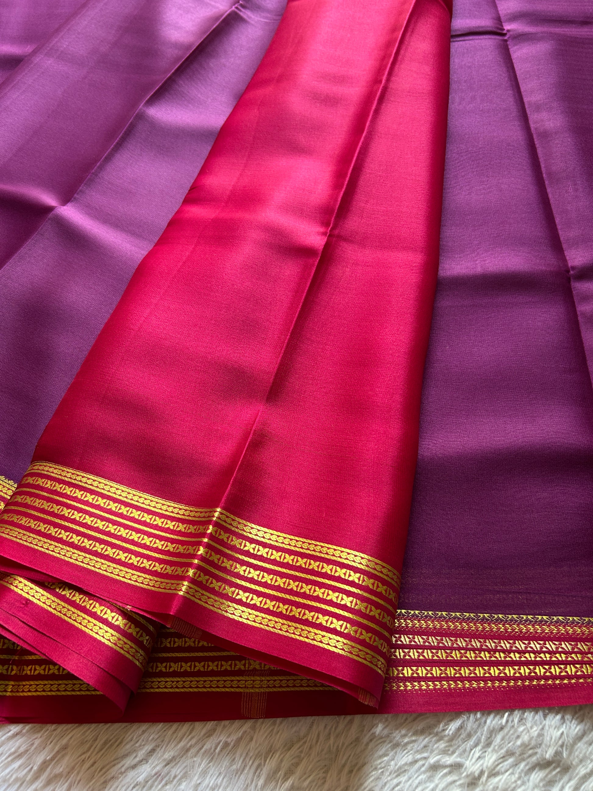 Deeksha epitomizes refined elegance with its plum lightweight Mysore crepe silk construction at 60 GSM—a fabric celebrated for its fluid drape and subtle sheen. The sophisticated plum tone is beautifully complemented by a pink border adorned with classic zari work, creating a harmonious interplay of color and traditional craftsmanship. This saree strikes the perfect balance between comfort and grace, ideal for those who appreciate understated luxury and timeless design.