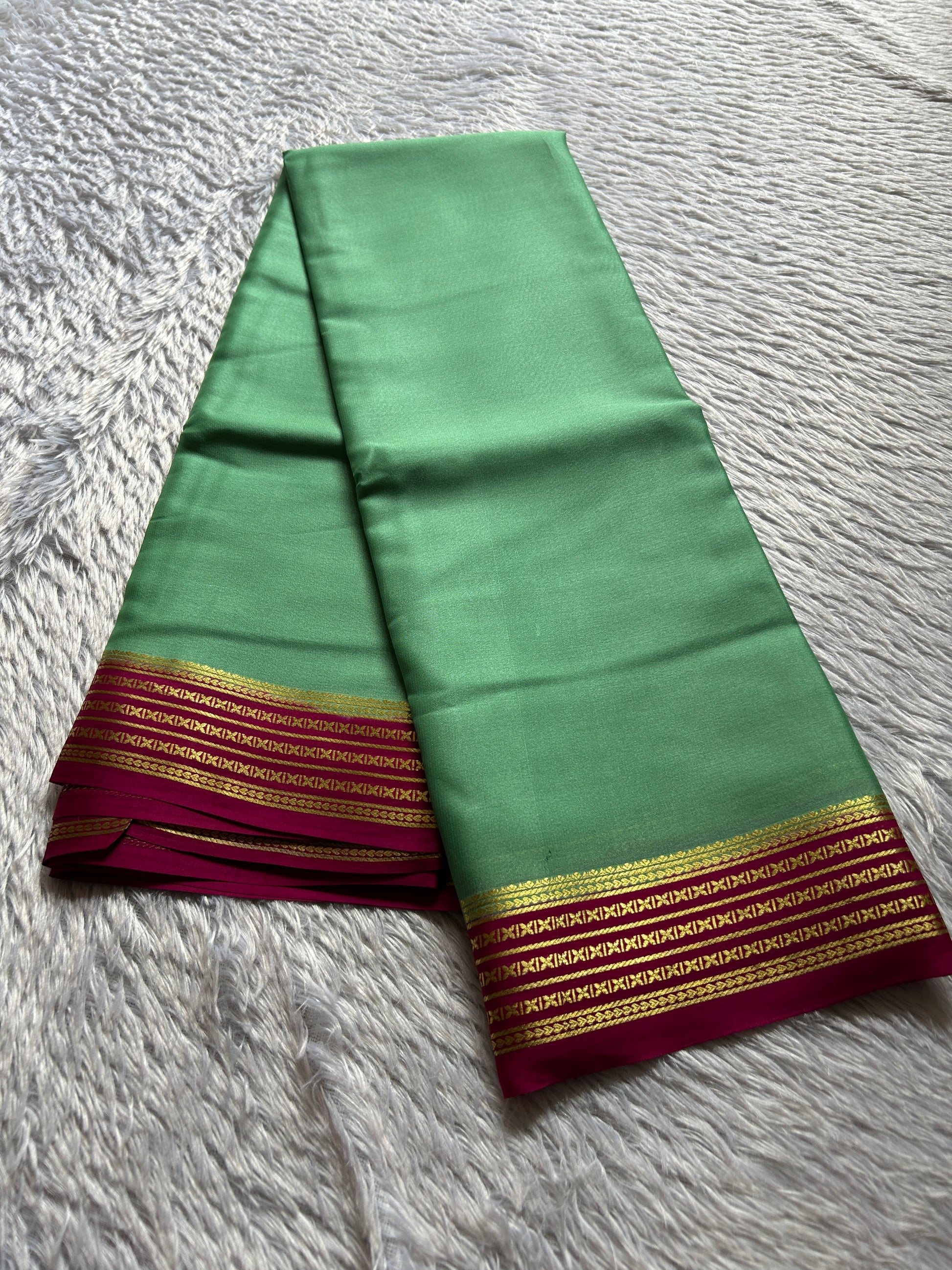 This turquoise Mysore crepe silk saree, weighing a delicate 60 GSM, offers unmatched lightness and elegance. Featuring a refined pink border detailed with intricate zari work, it blends subtle shine and craftsmanship effortlessly. The saree’s breathable silk fabric ensures comfort while maintaining a luxurious drape, ideal for sophisticated occasions. Perfect for those who appreciate traditional finesse paired with a modern, lightweight feel.