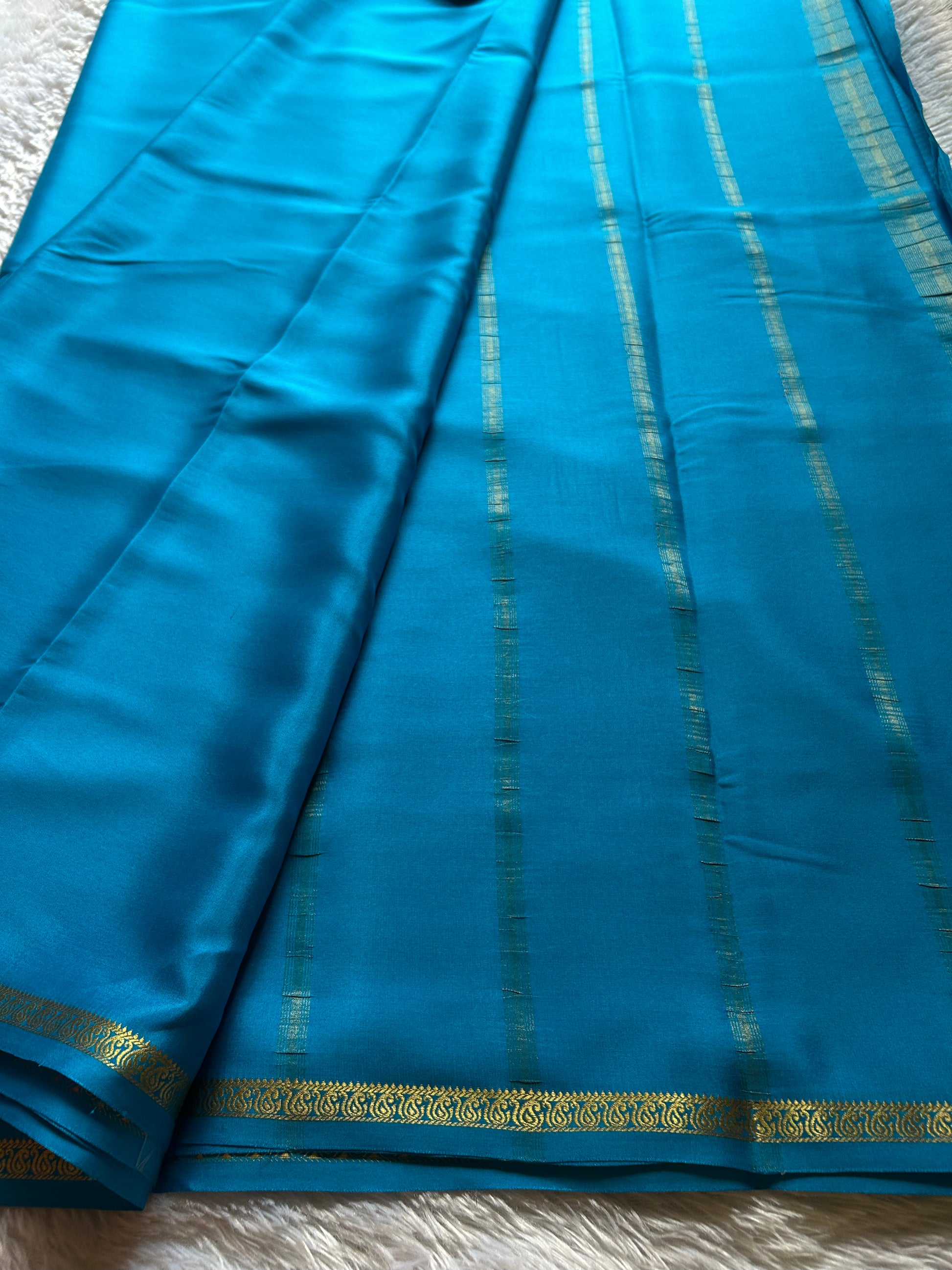 Deepa showcases the timeless elegance of pure Mysore crepe silk in a serene ananda blue shade. This sophisticated saree features an intricately detailed zari border that adds refined glamour without overwhelming the fabric's natural drape. The lightweight crepe construction ensures comfortable wear throughout the day, while the lustrous silk delivers that coveted subtle sheen. Perfect for both formal occasions and elevated everyday styling, this piece exemplifies the craftsmanship Nalmè Saree Studio is known for. The delicate zari work complements the solid base beautifully, creating a versatile canvas for personal expression.