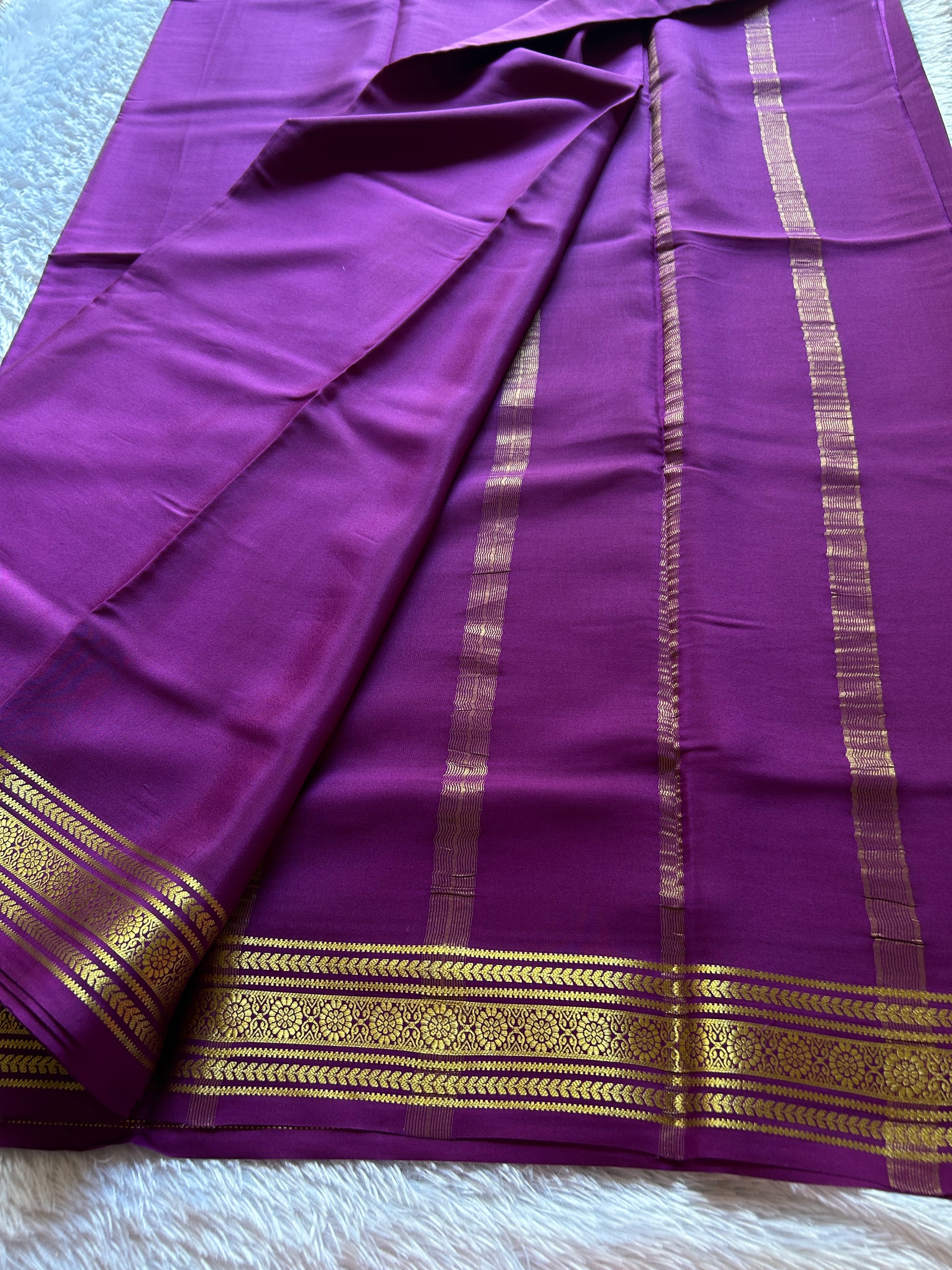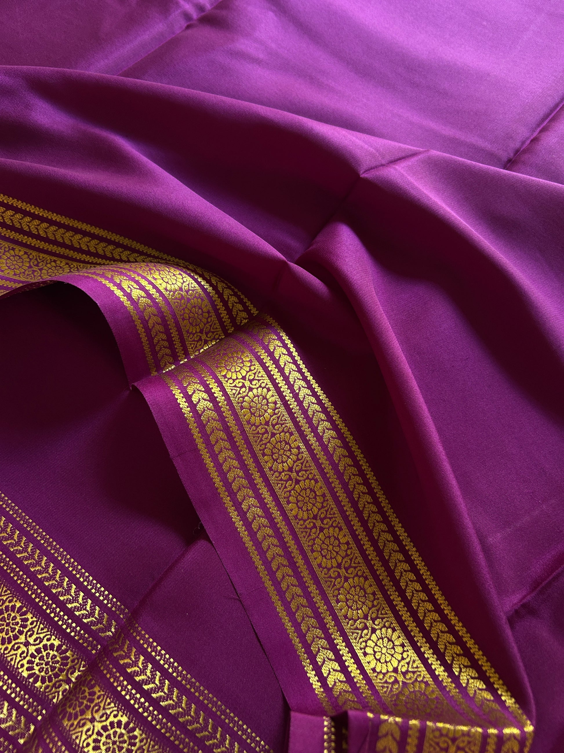 Experience the elegance of the Devika Solid dark magenta saree, crafted from pure Mysore crepe silk. This exquisite saree features a delicate lavender hue complemented by an intricate zari work border, showcasing traditional craftsmanship. Its smooth texture and refined drape make it ideal for formal occasions, offering both comfort and timeless sophistication.