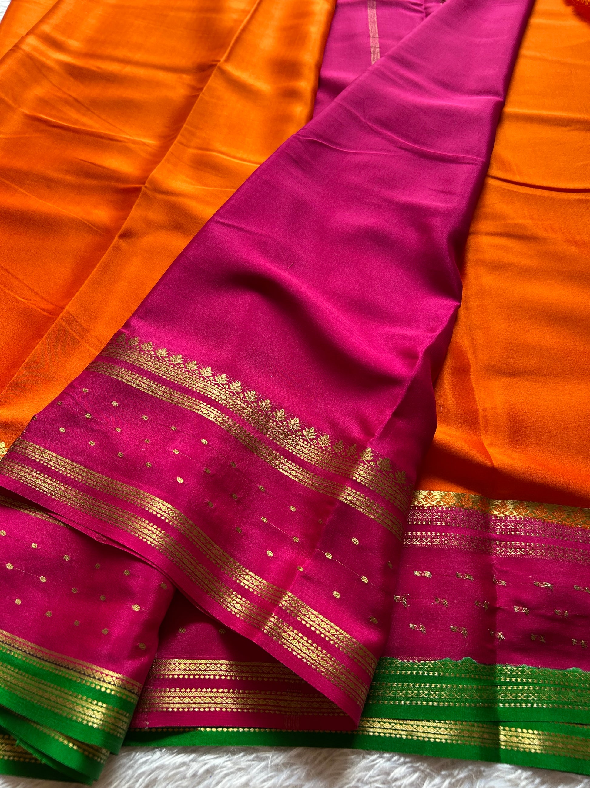 This saree features an orange pure Mysore crepe silk with a stunning pink and green border adorned with zari dots. Its elegant design offers a perfect blend of traditional and modern styles. Crafted with the finest materials, it offers both comfort and sophistication.