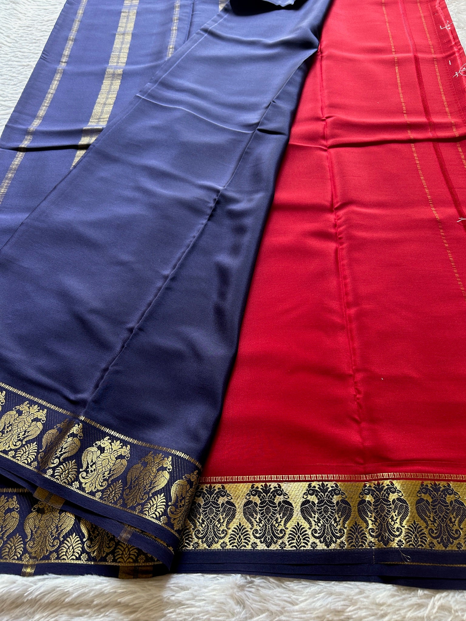 This red pure Mysore crepe silk saree, made from 110 GSM fabric, features a dark blue traditional zari GandaBerunda border. Combining elegance with intricate craftsmanship, it reflects the rich heritage of Mysore silk, ideal for discerning connoisseurs seeking timeless sophistication.