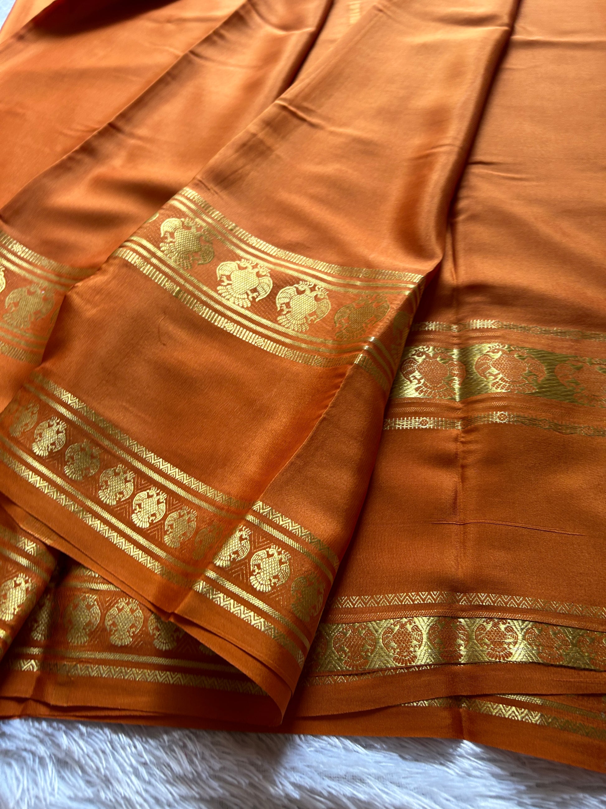 This exquisite light orange Mysore crepe silk saree features a striking big gap border adorned with a prominent zari GandaBerunda motif on the inner side and a smaller, delicate version on the outer side. The interplay of bold and subtle zari work accentuates the traditional design, making it an elegant choice for connoisseurs of classic silk sarees. Its smooth crepe texture enhances drape and comfort, presenting a refined silhouette that embodies heritage and craftsmanship.