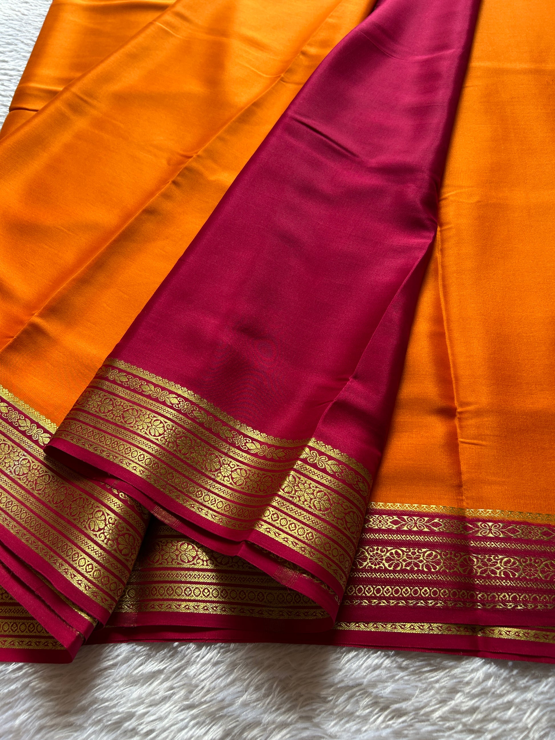 This exquisite Mysore crepe silk saree in vibrant orange features a striking green and pink Ganga Jamuna border adorned with detailed zari craftsmanship. The pink pallu is beautifully accented with delicate zari lines, enhancing its traditional elegance. Perfectly blending classic artistry with rich colors, this saree exemplifies refined sophistication for special occasions.