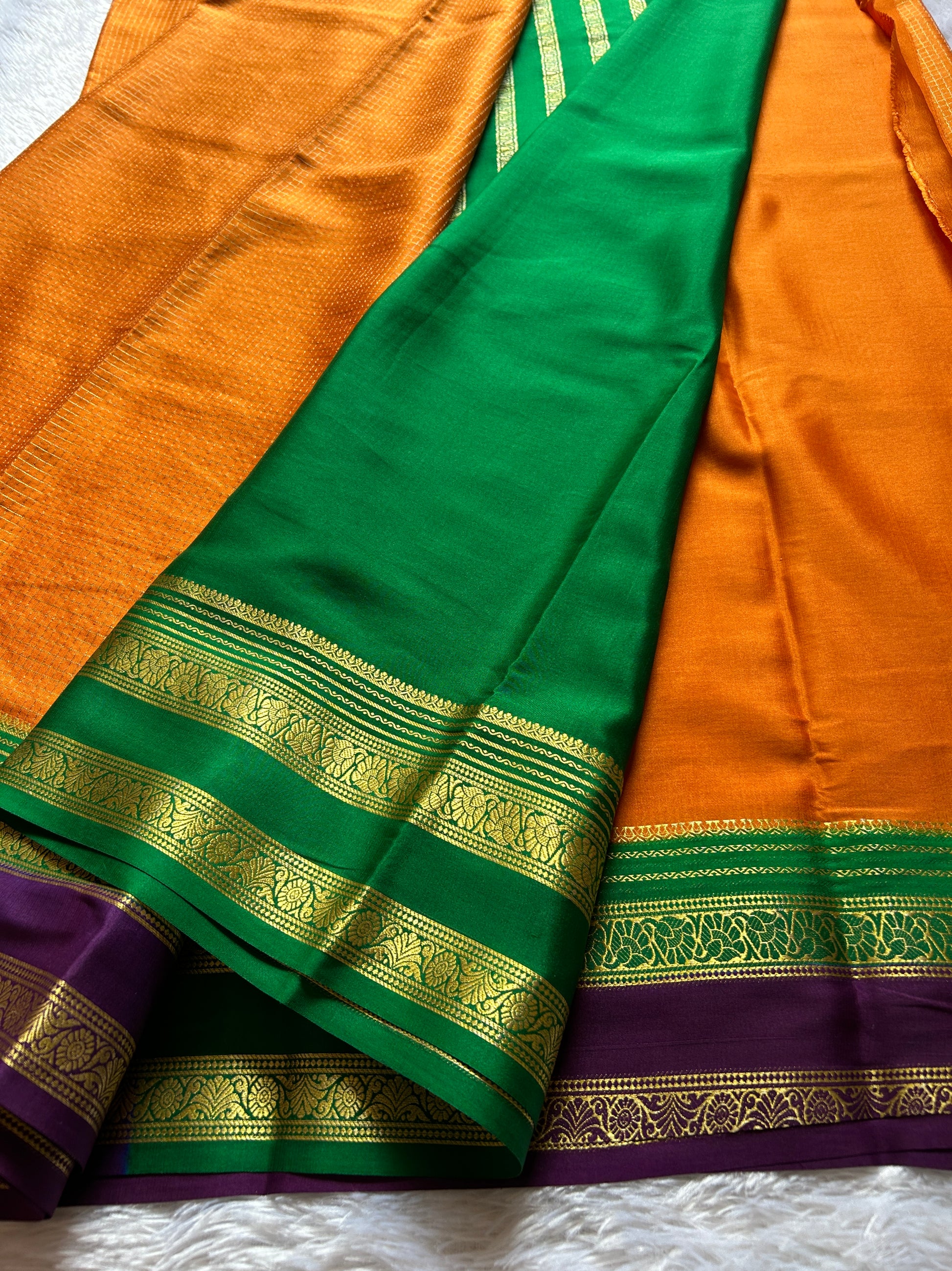 Elevate your style with the vibrant Gayatri saree. Made from pure Mysore crepe silk, the eye-catching orange fabric features intricate zari checks for a touch of luxury. The green and plum border adds a beautiful contrast. Perfect for any occasion, this saree is a must-have for your wardrobe.