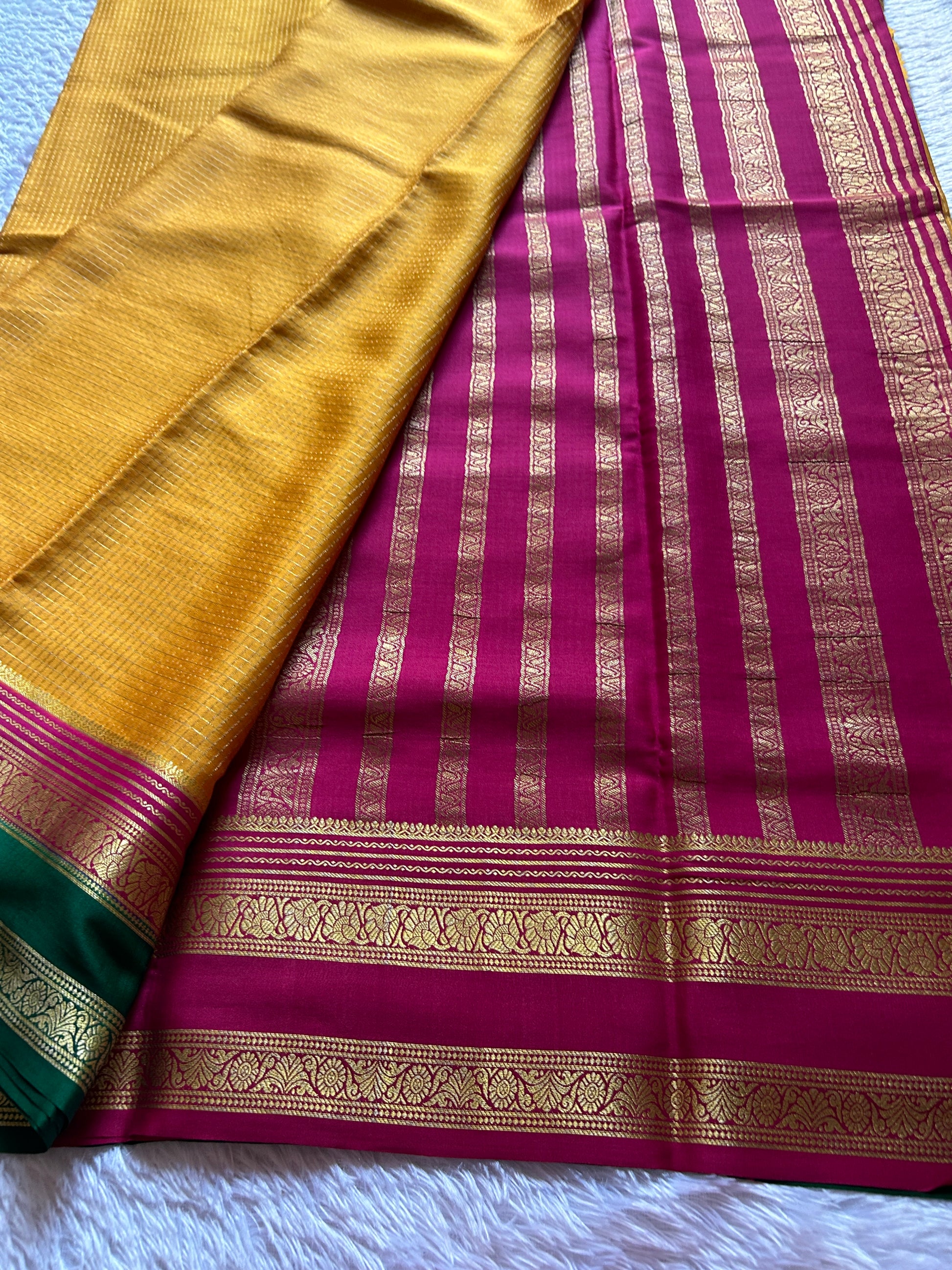 Experience the luxurious feel of pure Mysore crepe silk with yellow Gayatri saree. The intricate zari checks add a touch of elegance to this saree, while the pink & green border give it a pop of color. Elevate your wardrobe with this stunning saree.
