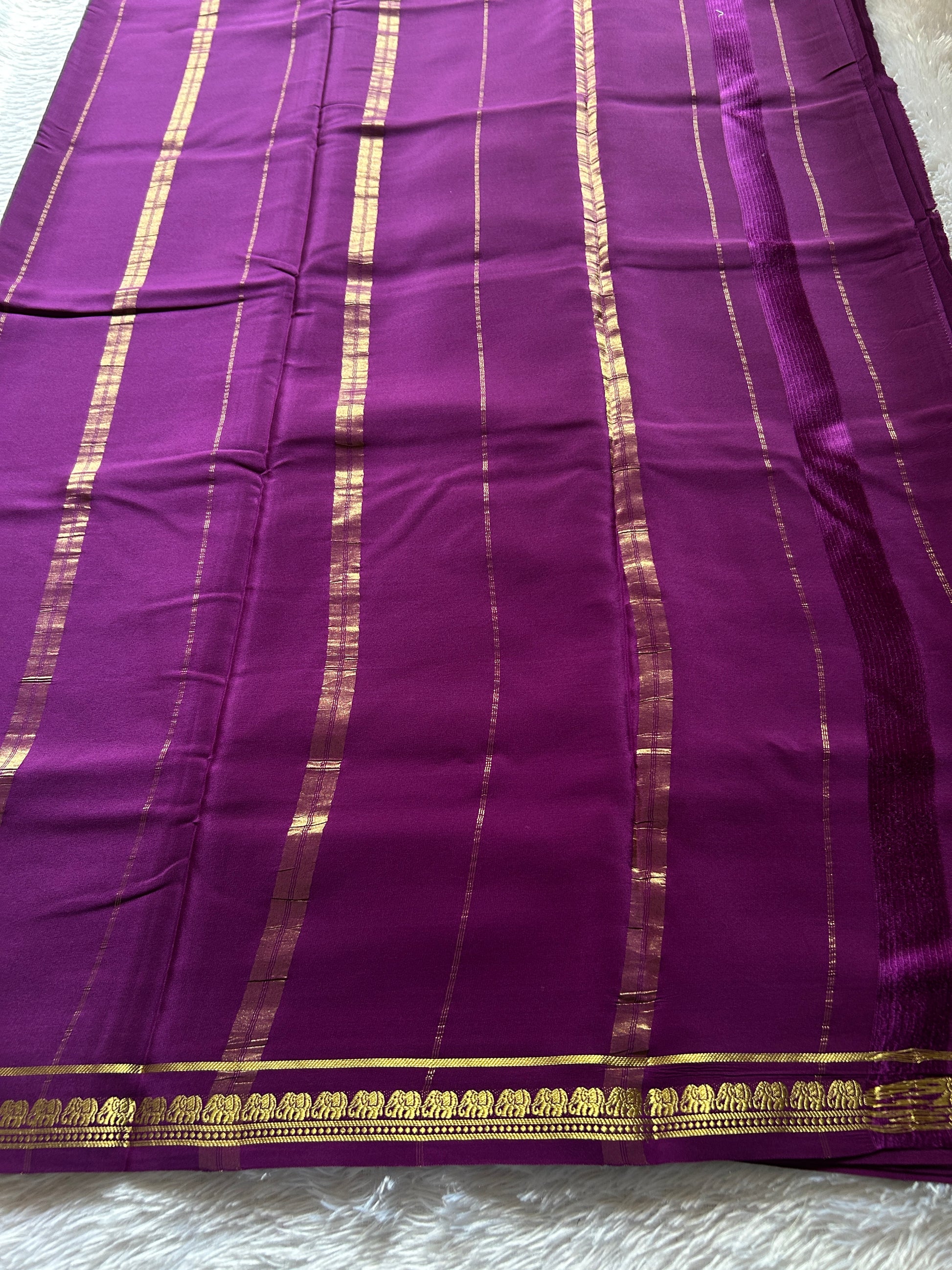 This Gowri Solid Dark Magenta saree is crafted from pure Mysore silk, renowned for its lustrous texture and durability. It features a delicate gold zari border adorned with elegant elephant motifs, symbolizing grace and tradition. The subtle gold zari work on the pallu enhances its rich appeal, making it an exquisite choice for formal occasions and celebrations. Its vibrant magenta hue and intricate detailing reflect expert craftsmanship, perfect for those seeking a blend of classic elegance and cultural heritage.